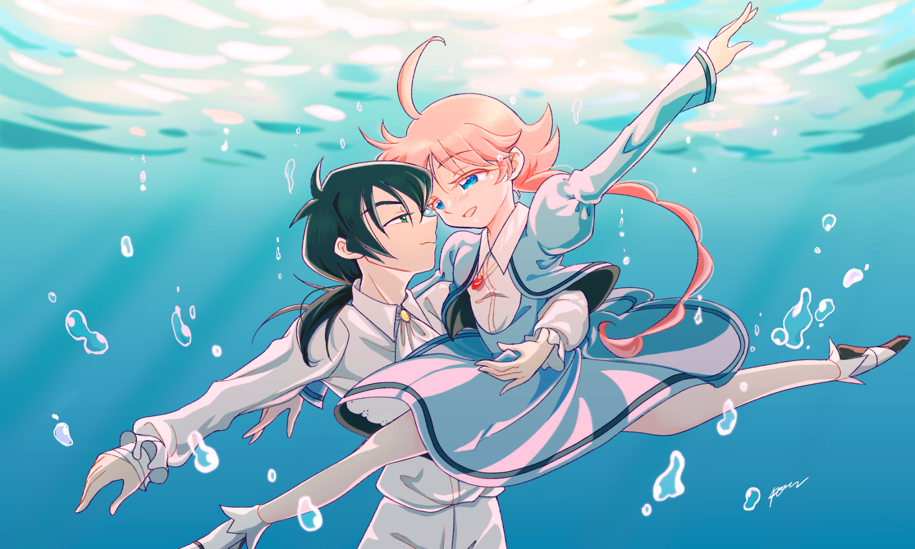 1boy 1girl ahiru_(princess_tutu) ahoge ballerina ballerino ballet beefmarron black_hair blue_eyes commentary_request dress fakir_(princess_tutu) gold_crown_academy_school_uniform green_eyes highres jewelry long_hair necklace open_mouth orange_hair princess_tutu school_uniform smile