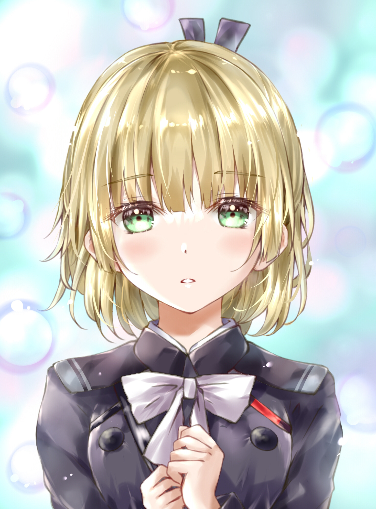 1girl ayaro_(genkiloobaii) black_jacket black_ribbon blonde_hair blue_background blunt_bangs blush bow bowtie buttons clenched_hands collared_jacket commentary_request double-breasted eyelashes eyes_visible_through_hair green_eyes hair_between_eyes hair_ribbon half_updo heaven_burns_red highres jacket looking_at_viewer medium_hair military_uniform nanase_nanami_(heaven_burns_red) parted_lips ribbon simple_background soap_bubbles solo upper_body white_bow white_bowtie