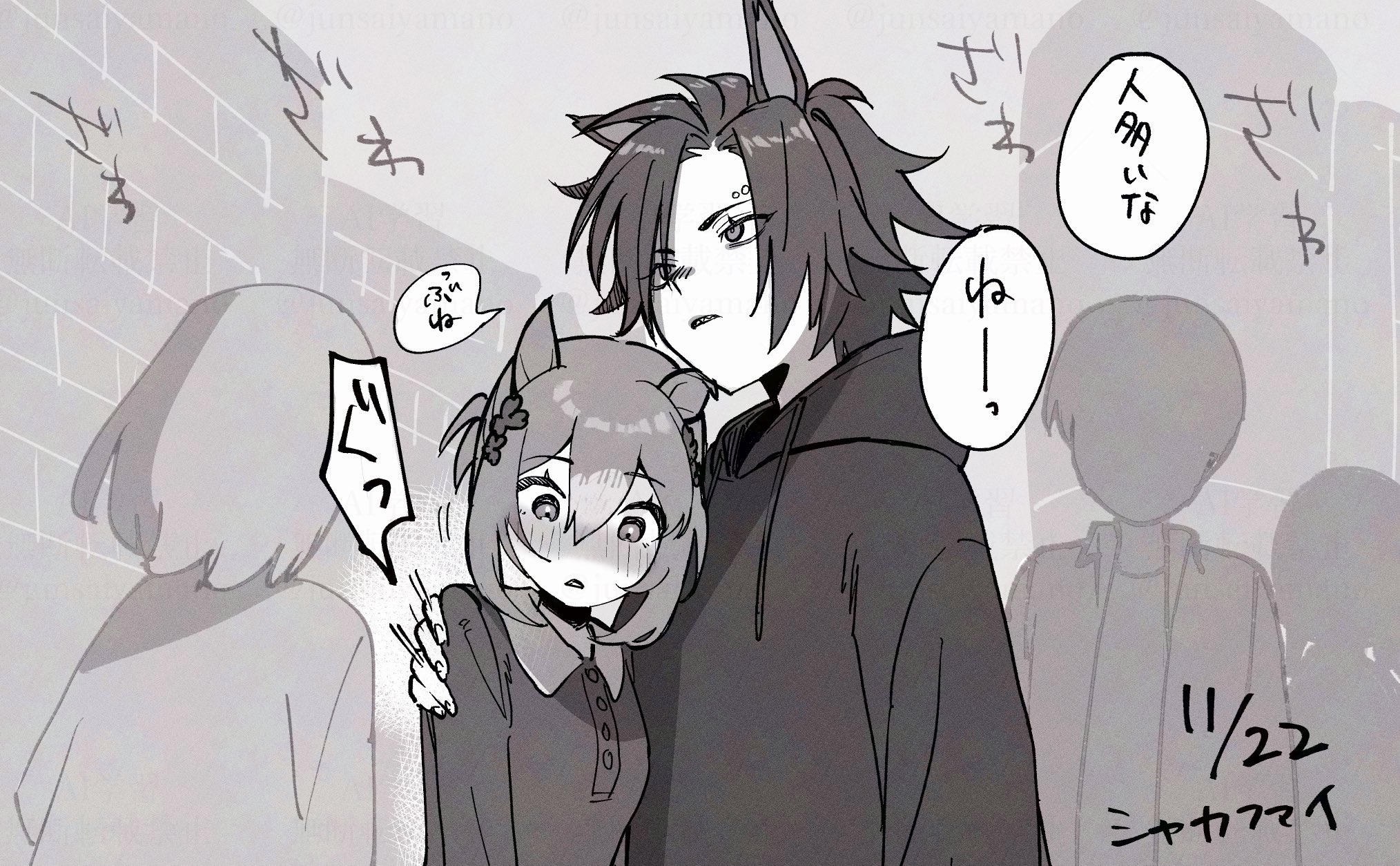 2girls air_shakur_(umamusume) animal_ears blush butch/femme_couple city clover_hair_ornament collared_shirt commentary_request dated downturned_eyes dress_shirt expressionless eyelashes eyes_visible_through_hair face_piercing fine_motion_(casual)_(umamusume) fine_motion_(umamusume) fingernails flustered forehead_piercing greyscale hair_between_eyes hair_ornament hair_over_one_eye hand_on_another's_shoulder height_difference highres hood hood_down hoodie horse_ears horse_girl junsaiyamano long_sleeves messy_hair monochrome motion_lines multicolored_hair multiple_girls outdoors parted_lips people piercing sharp_teeth shirt short_hair signature speech_bubble streaked_hair teeth thick_eyebrows translation_request umamusume upper_body yuri