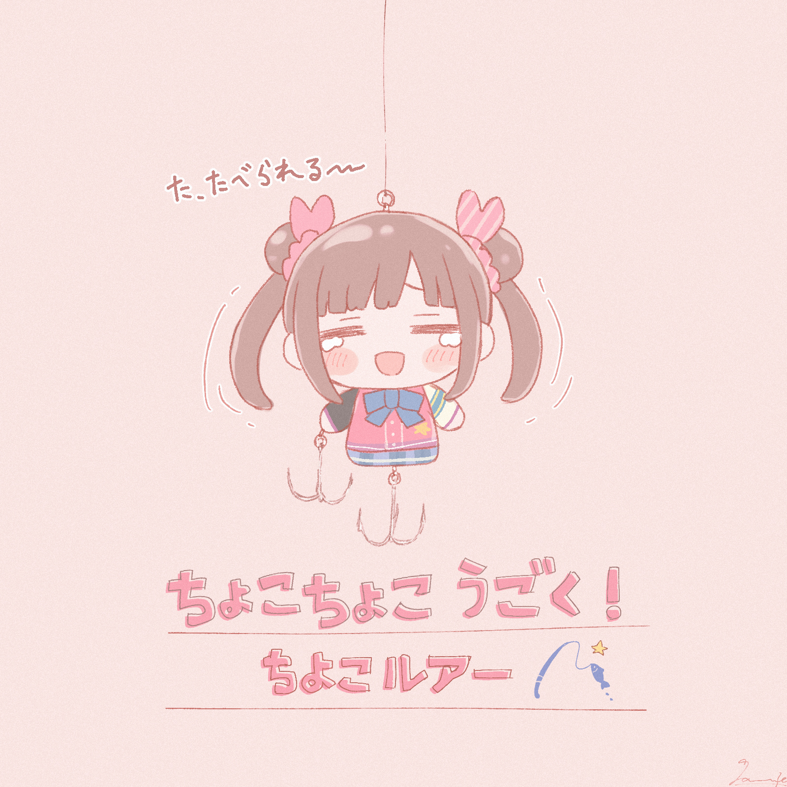 1girl :d blue_skirt brown_background brown_hair chibi closed_eyes commentary_request double_bun fish_hook fishing_line fishing_lure gameso hair_bun highres idolmaster idolmaster_shiny_colors jacket motion_lines open_mouth pink_jacket plaid_clothes plaid_skirt signature simple_background skirt smile solo sonoda_chiyoko star_(symbol) tears translation_request twintails