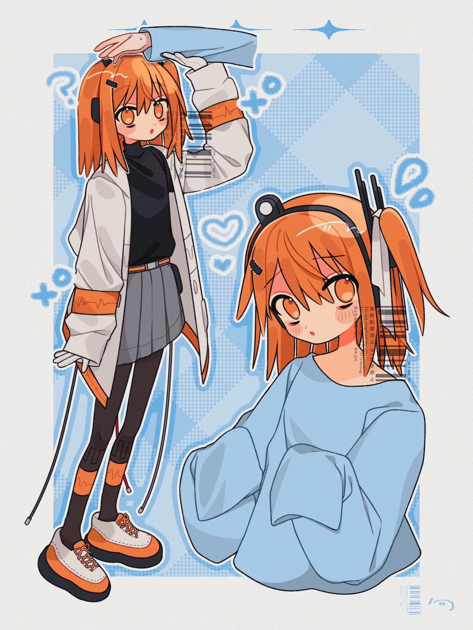 1girl 1other a.i._voice adachi_rei black_pantyhose blue_background blue_shirt commentary full_body grey_skirt headpat highres jacket long_sleeves looking_at_viewer medium_hair miniskirt multiple_views nasi_(na_si) one_side_up open_clothes open_jacket orange_eyes orange_hair pantyhose pleated_skirt shirt skirt sleeves_past_fingers sleeves_past_wrists standing symbol-only_commentary upper_body utau watermark white_jacket