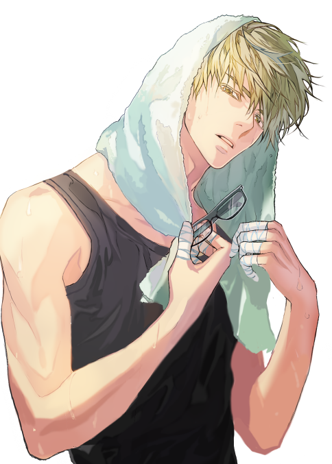 1boy aso_lago bandaged_fingers bandages black-framed_eyewear black_tank_top commentary_request glasses green_hair holding holding_removed_eyewear kuroko_no_basuke looking_at_viewer male_focus midorima_shintarou parted_lips rectangular_eyewear short_hair simple_background solo sweat tank_top teeth towel towel_on_head unworn_eyewear upper_body white_background