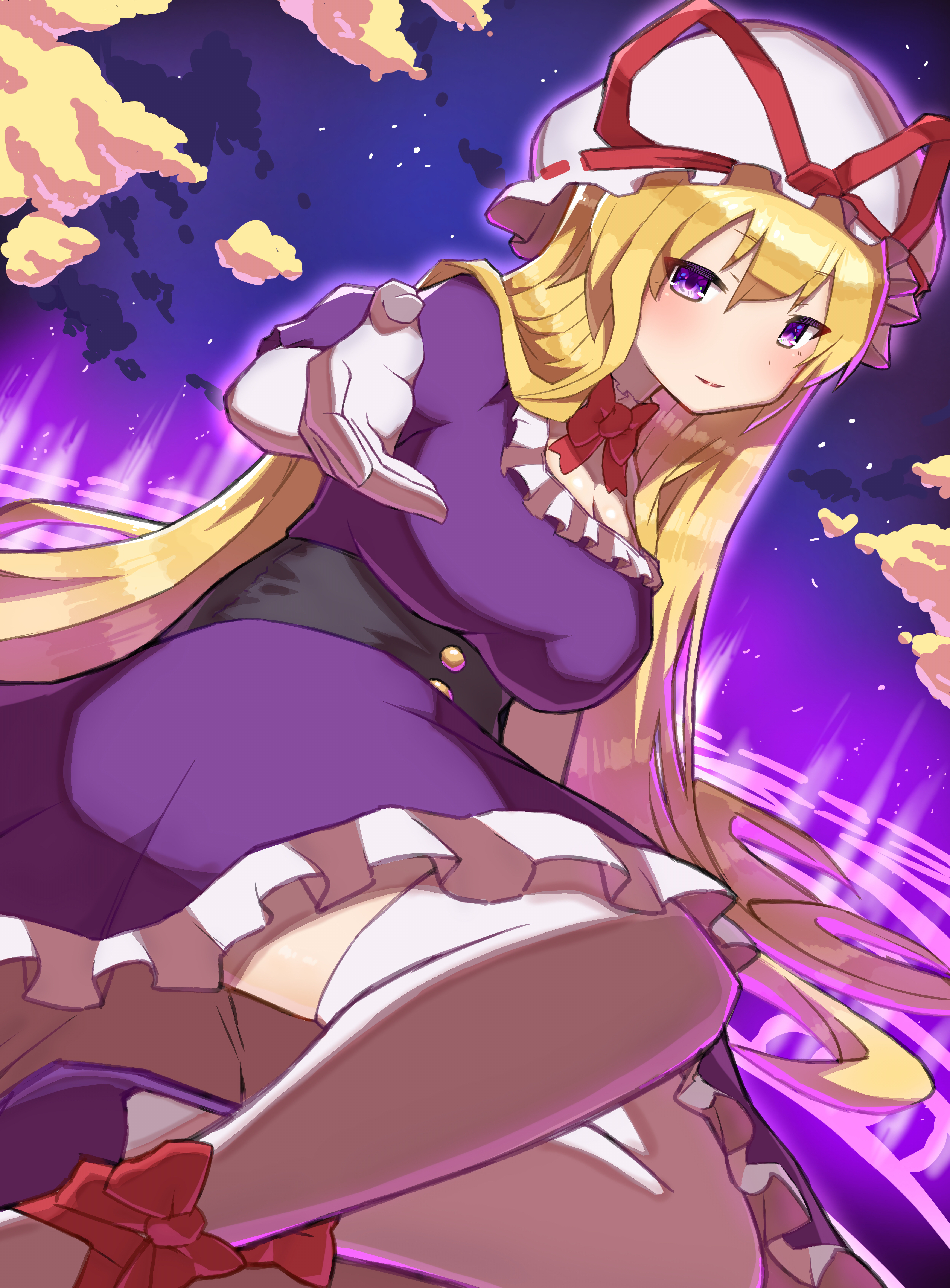 1girl absurdres blonde_hair breasts choker cleavage cloud commentary_request dress elbow_gloves frills gloves hat highres kasuokasuto large_breasts light_smile long_hair mob_cap night outstretched_arm purple_dress purple_eyes purple_shoes ribbon_choker shoes short_sleeves sitting solo thighhighs thighs touhou very_long_hair white_gloves white_thighhighs yakumo_yukari