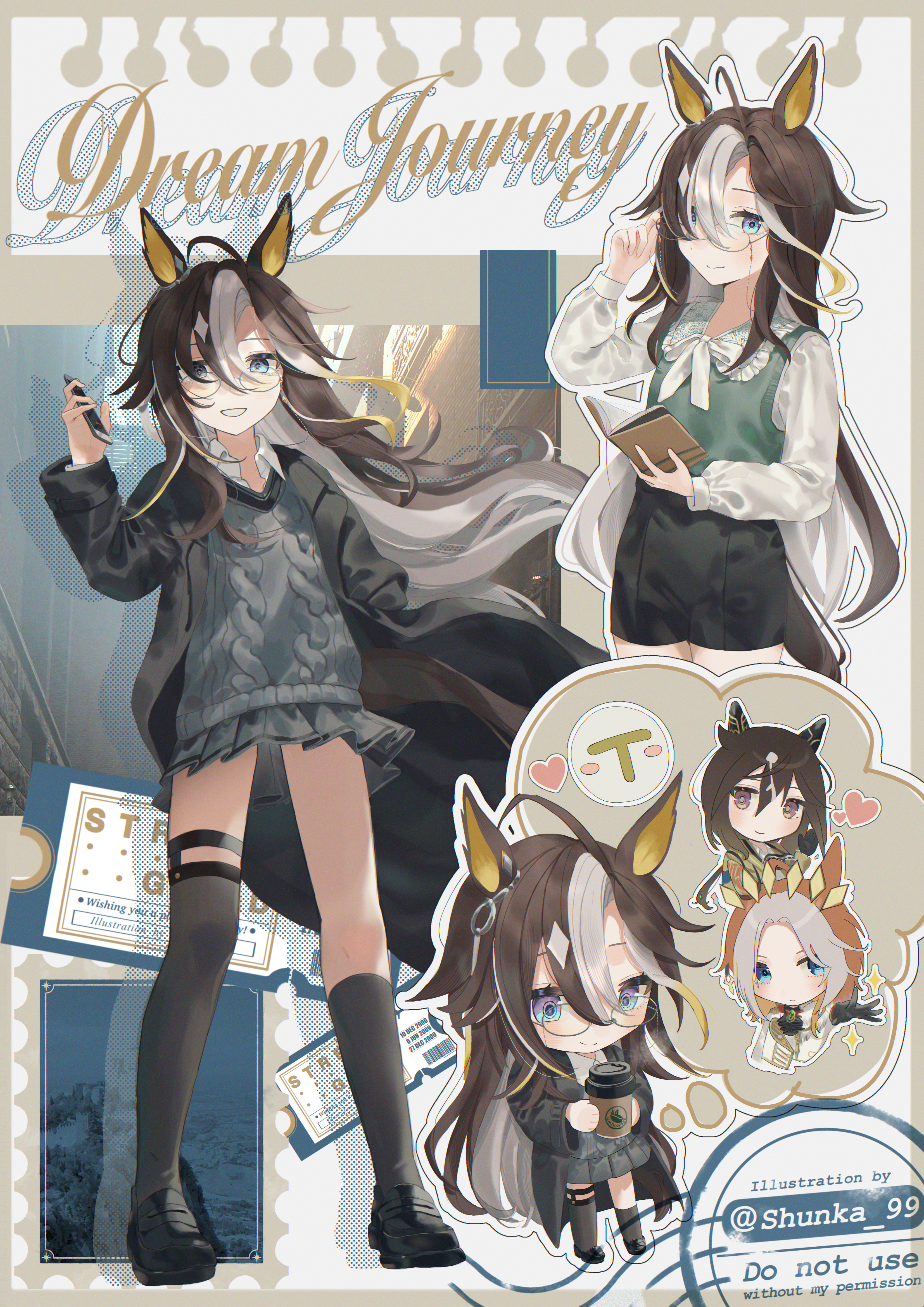 1other 3girls absurdres ahoge animal_ears ascot asymmetrical_legwear black_ascot black_coat black_gloves black_shorts black_skirt black_socks black_thighhighs blue_eyes blush book brown_eyes brown_hair cellphone closed_mouth coat commentary_request cup disposable_coffee_cup disposable_cup dream_journey_(umamusume) ear_covers eyewear_strap glasses gloves grey_sweater hair_between_eyes heart highres holding holding_book holding_cup holding_phone horse_ears horse_girl horse_tail jacket kneehighs long_hair long_sleeves looking_at_viewer multicolored_hair multiple_girls open_clothes open_coat open_mouth orange_hair orfevre_(control)_(umamusume) orfevre_(umamusume) phone pleated_skirt shirt shoes shorts shunka_shuto single_ear_cover skirt smartphone smile socks speech_bubble stay_gold_(sunlit_outsider)_(umamusume) stay_gold_(umamusume) sweater t-head_trainer_(umamusume) tail thigh_strap thighhighs thought_bubble ticket trainer_(umamusume) two-tone_hair umamusume uneven_legwear white_coat white_hair white_shirt yellow_coat