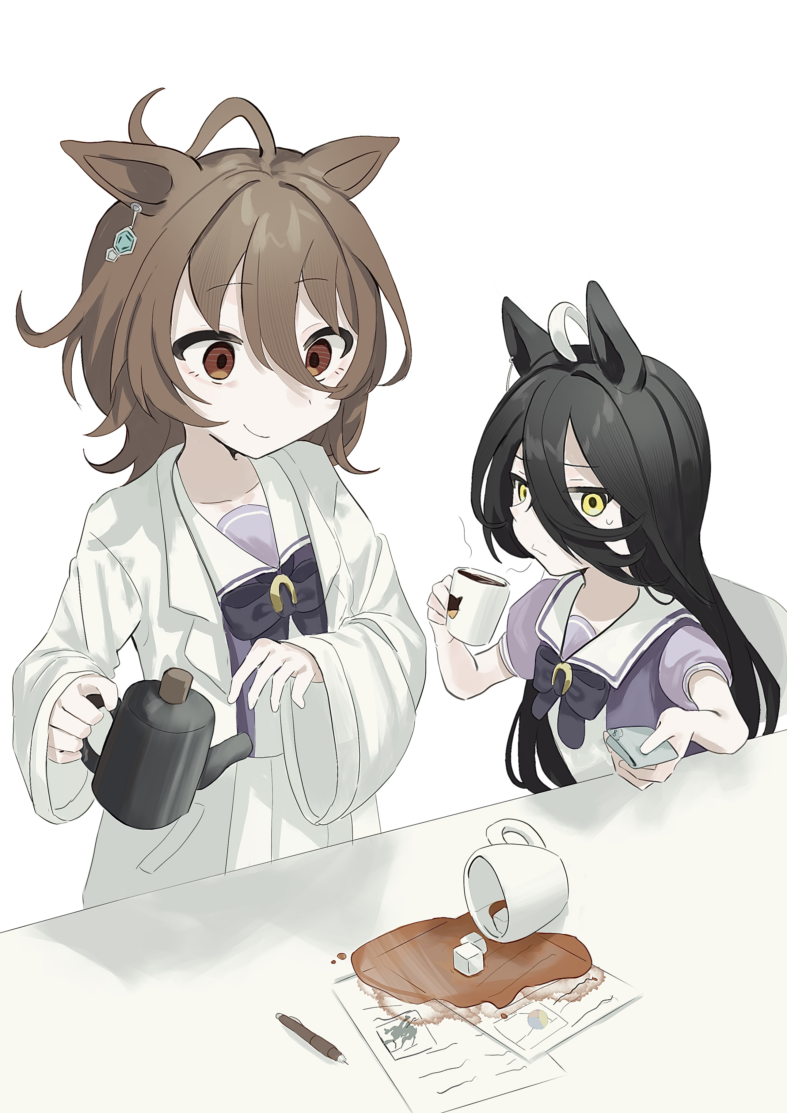 1girl 2girls absurdres agnes_tachyon_(umamusume) ahoge animal_ears black_hair blush bow bowtie brown_hair chemical_structure closed_mouth coat coffee_mug commentary_request cup earrings hair_between_eyes highres holding holding_cup holding_napkin holding_teapot horse_ears horse_girl jewelry lab_coat long_bangs long_hair long_hair_between_eyes long_sleeves manhattan_cafe_(umamusume) mug multicolored_hair multiple_girls paper pencil puffy_short_sleeves puffy_sleeves purple_bow purple_bowtie purple_shirt red_eyes sailor_collar sailor_shirt school_uniform shirt short_hair short_sleeves shunka_shuto single_earring smile spill sugar_cube tea teapot tracen_school_uniform umamusume very_long_hair white_coat white_hair white_sailor_collar yellow_eyes
