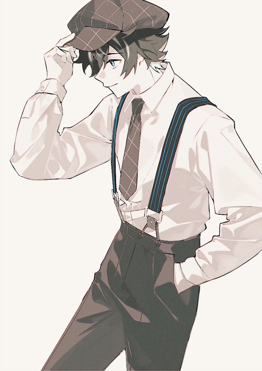 1boy black_hair black_pants blue_eyes brown_hat brown_necktie charlemagne_(disguise_costume)_(fate) charlemagne_(fate) chinese_commentary closed_mouth collared_shirt commentary_request fate/grand_order fate_(series) hand_in_pocket hat idass_(idass16) long_sleeves looking_ahead male_focus multicolored_hair necktie newsboy_cap pants shirt short_hair simple_background smile solo suspenders two-tone_hair white_background white_hair white_shirt wing_collar