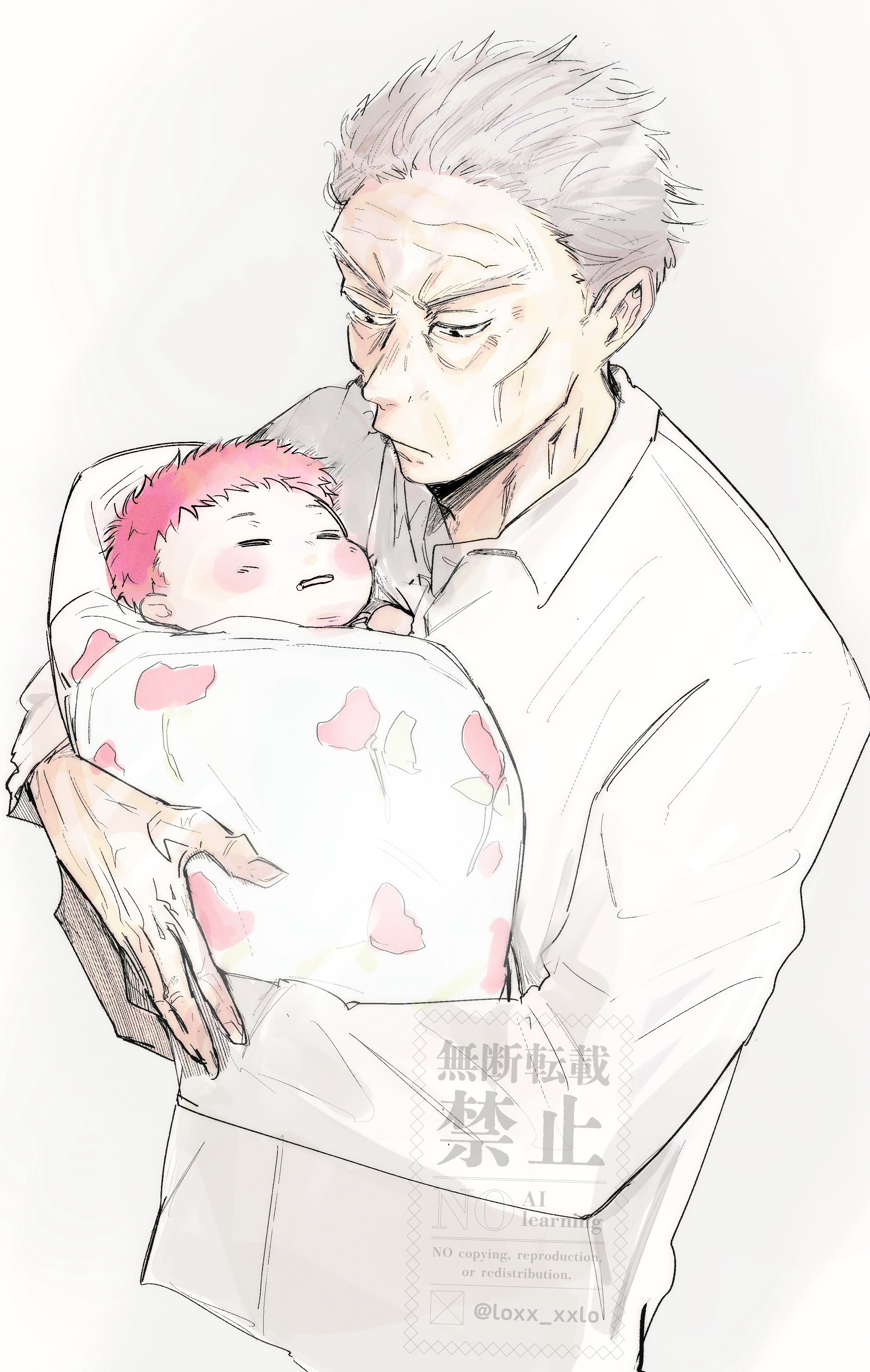 2boys absurdres baby baby_carry blush carrying carrying_baby carrying_person closed_mouth commentary_request cropped_torso grandfather_and_grandson highres itadori_wasuke itadori_yuuji jujutsu_kaisen loxx_xxlo male_focus multiple_boys old old_man pink_hair short_hair simple_background sleeping watermark white_background white_hair