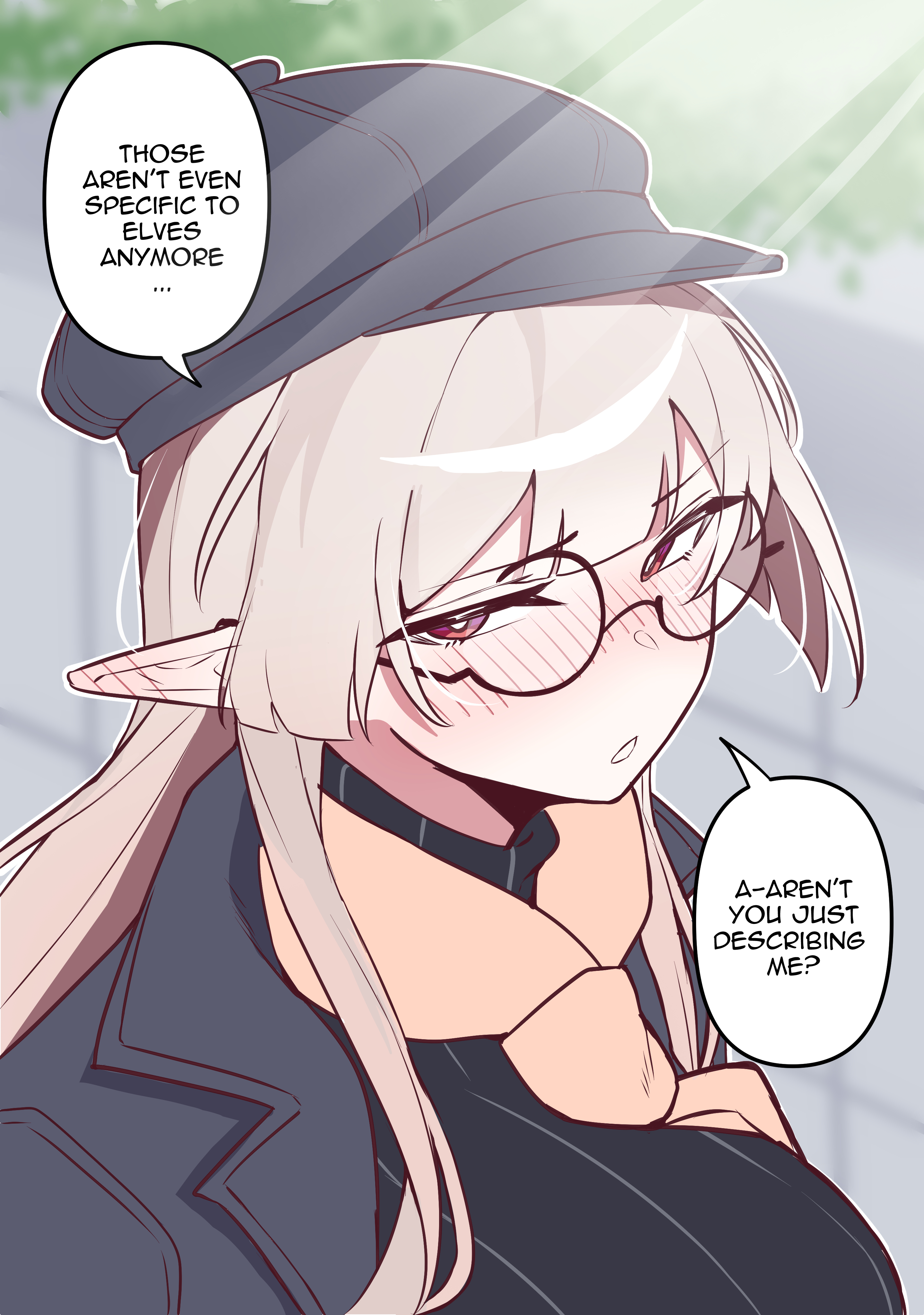 1girl absurdres black_hat black_jacket black_shirt blurry blurry_background blush breasts commentary day double-parted_bangs ear_blush elf english_commentary english_text glasses grey_hair hat highres jacket large_breasts long_hair looking_at_viewer mirui09 open_clothes open_jacket open_mouth original outdoors pointy_ears portrait red_eyes shirt sidelocks solo speech_bubble talking
