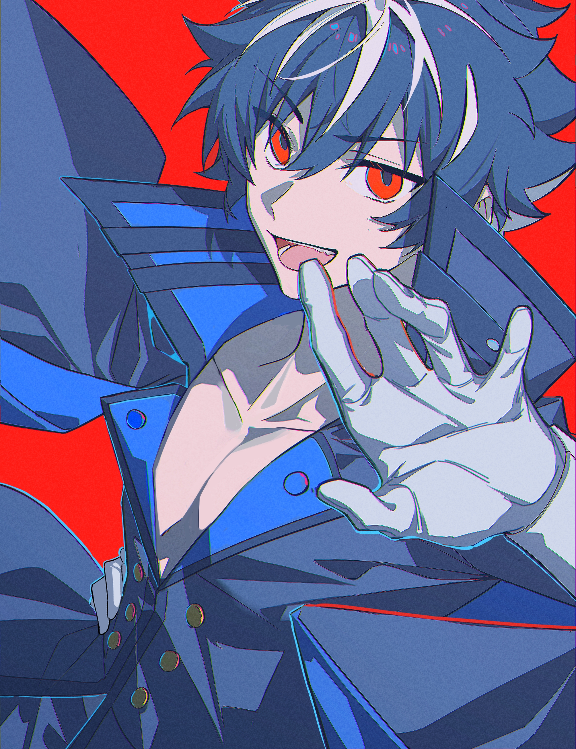 1boy absurdres black_coat black_hair charlemagne_(ever_dark)_(fate) charlemagne_(fate) chinese_commentary chromatic_aberration coat commentary_request empty_eyes fate/grand_order fate_(series) film_grain gloves hair_between_eyes hand_on_own_hip hand_up highres idass_(idass16) long_sleeves looking_at_viewer male_focus multicolored_hair open_mouth pectoral_cleavage pectorals popped_collar red_background red_eyes short_hair simple_background smile solo streaked_hair two-tone_hair upper_body v-shaped_eyebrows white_gloves white_hair
