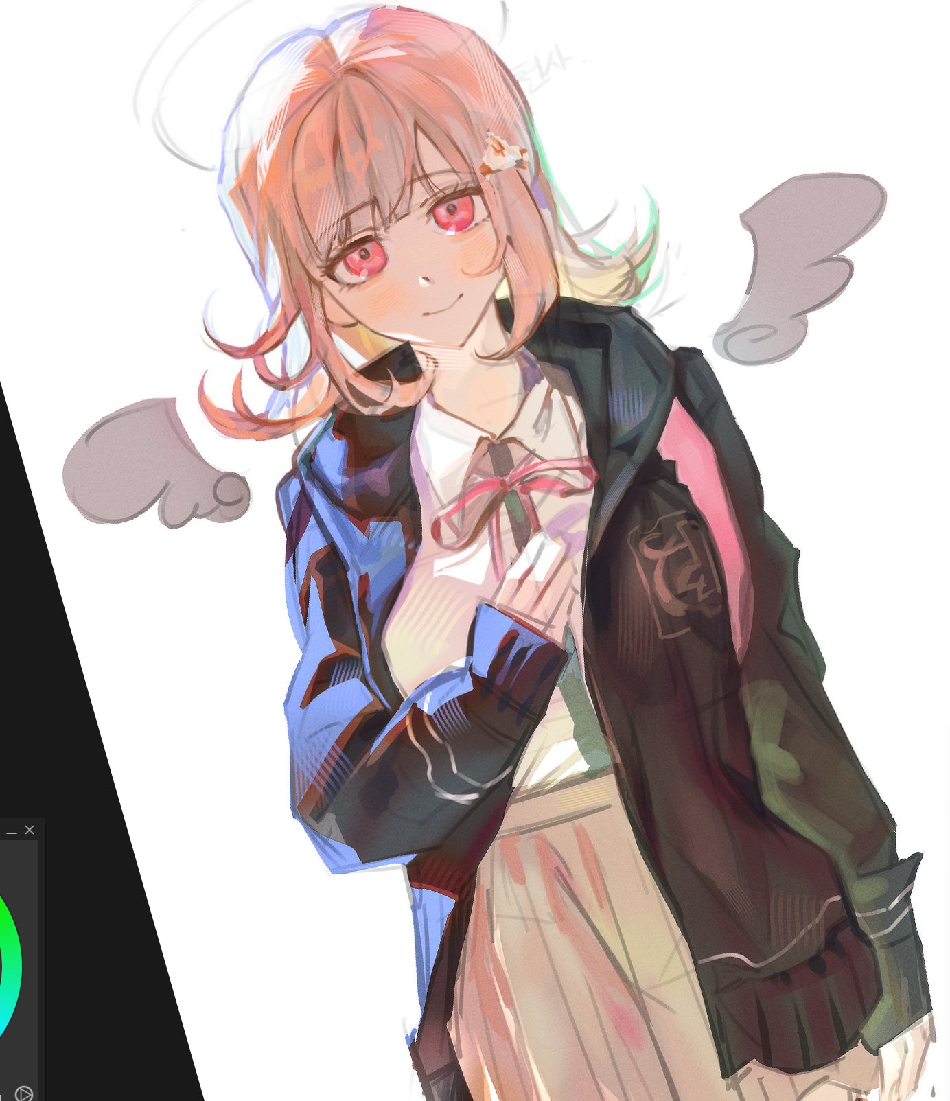 1girl breasts brown_hair collared_shirt commentary_request danganronpa_(series) danganronpa_2:_goodbye_despair flipped_hair hair_ornament hand_up highres hood hood_down jacket korean_commentary long_sleeves looking_at_viewer medium_hair nanami_chiaki neck_ribbon open_clothes open_jacket pink_eyes pink_ribbon reang_i ribbon shirt skirt smile solo white_shirt wings