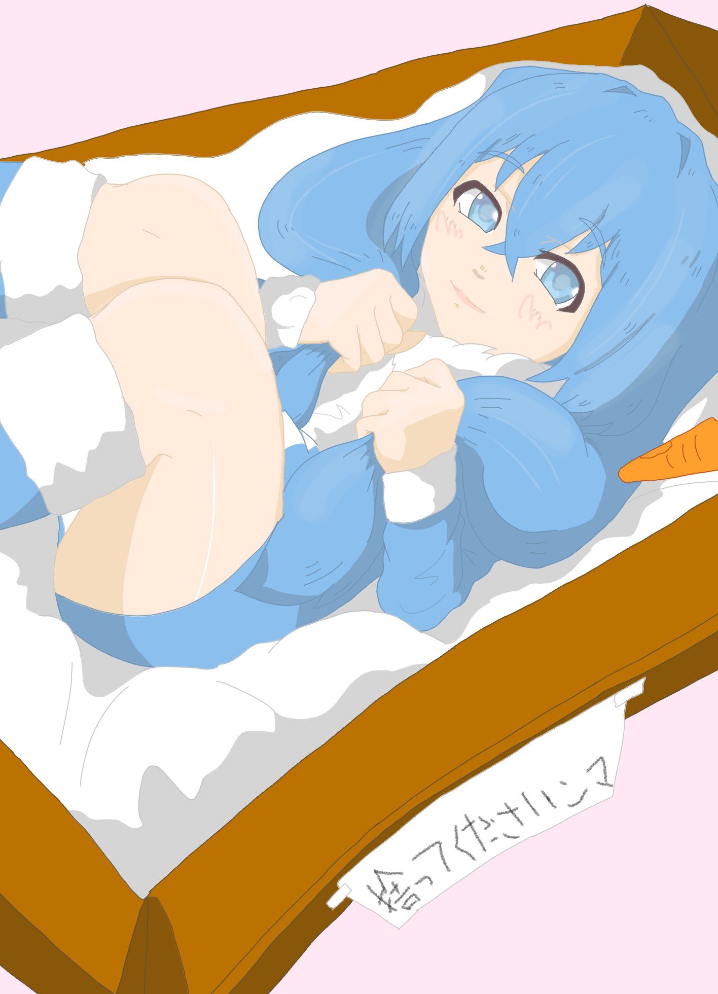 1boy animal_ears animal_nose blue_eyes blue_hair blue_shirt box closed_mouth commentary_request fur-trimmed_jacket fur_trim highres jacket kenma-kun koushinism looking_at_viewer lying male_focus nmakenma rabbit_boy rabbit_ears shirt trap