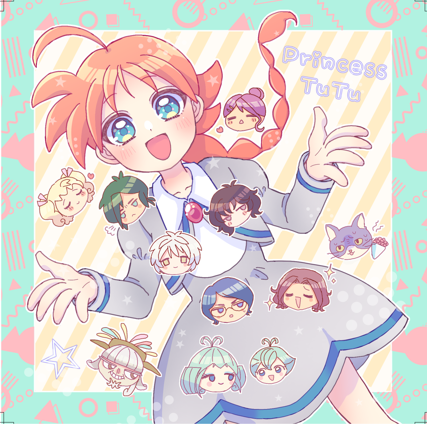 6+boys 6+girls ahiru_(princess_tutu) ahoge antenna_hair autor_(princess_tutu) black_hair blonde_hair blue_eyes blue_hair blunt_bangs blush braid cat chibi chibi_inset commentary_request dress drosselmeyer_(princess_tutu) edel_(princess_tutu) everyone fakir_(princess_tutu) femio glasses gold_crown_academy_school_uniform green_hair hair_bun heart highres iyaiku jacket lilie_(princess_tutu) long_hair long_sleeves multiple_boys multiple_girls mytho_(princess_tutu) neko-sensei old orange_hair pike_(princess_tutu) princess_tutu puffy_sleeves purple_hair rue_(princess_tutu) school_uniform single_braid smile twintails uzura_(princess_tutu) very_long_hair white_hair yellow_eyes