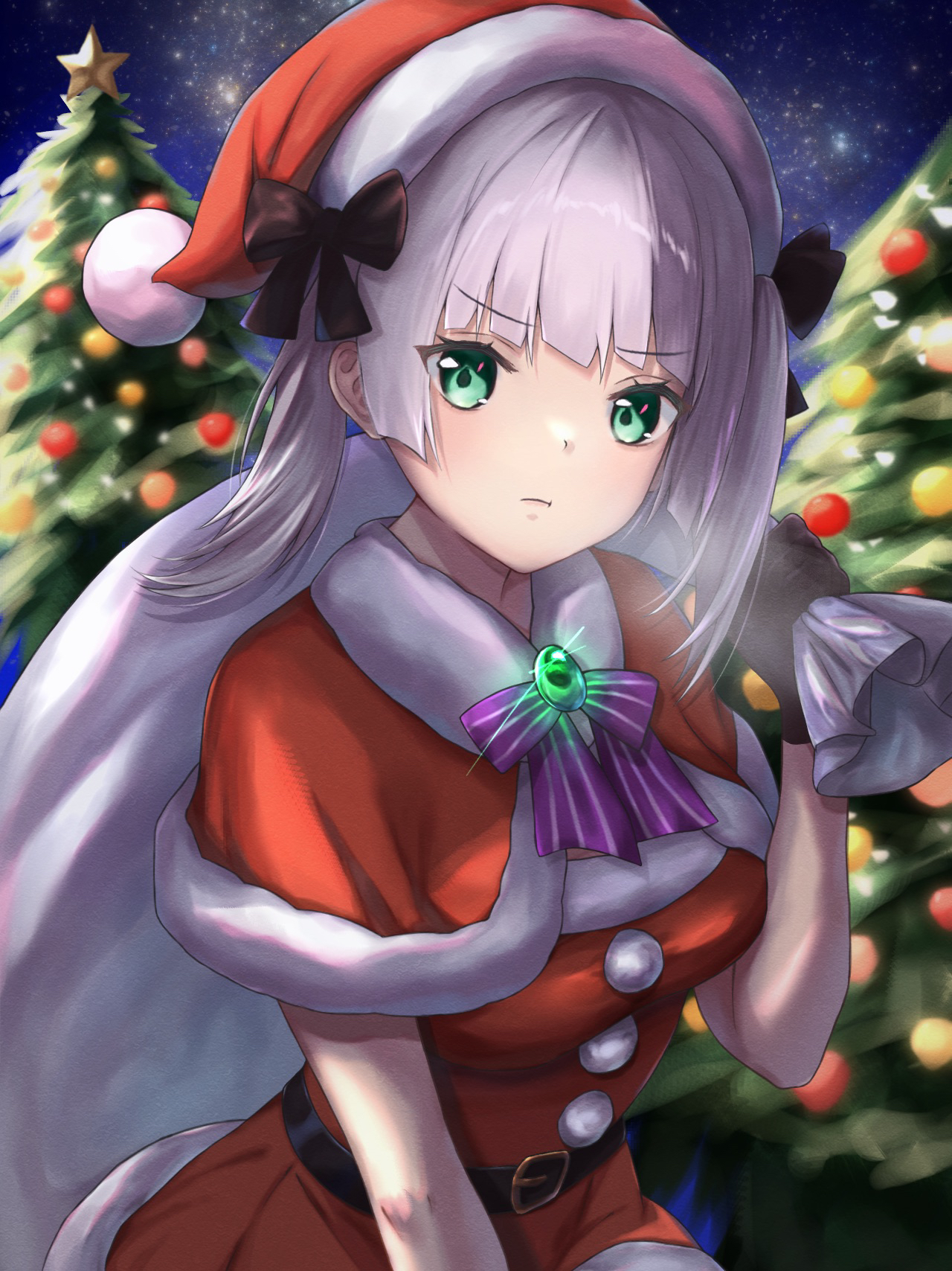 1girl :t alternate_costume belt black_belt black_bow black_gloves blunt_bangs blush bow bowtie brooch capelet christmas christmas_tree closed_mouth commentary_request cowboy_shot dress frown fur-trimmed_capelet fur-trimmed_dress fur-trimmed_headwear fur_trim gloves green_eyes grey_hair hand_up hat hat_bow heaven_burns_red highres holding holding_sack jewelry looking_at_viewer medium_hair night outdoors pom_pom_(clothes) purple_bow purple_bowtie red_capelet red_dress red_hat sack santa_costume santa_dress santa_hat sky solo star_(sky) starry_sky sugawara_chie twintails yu422yu