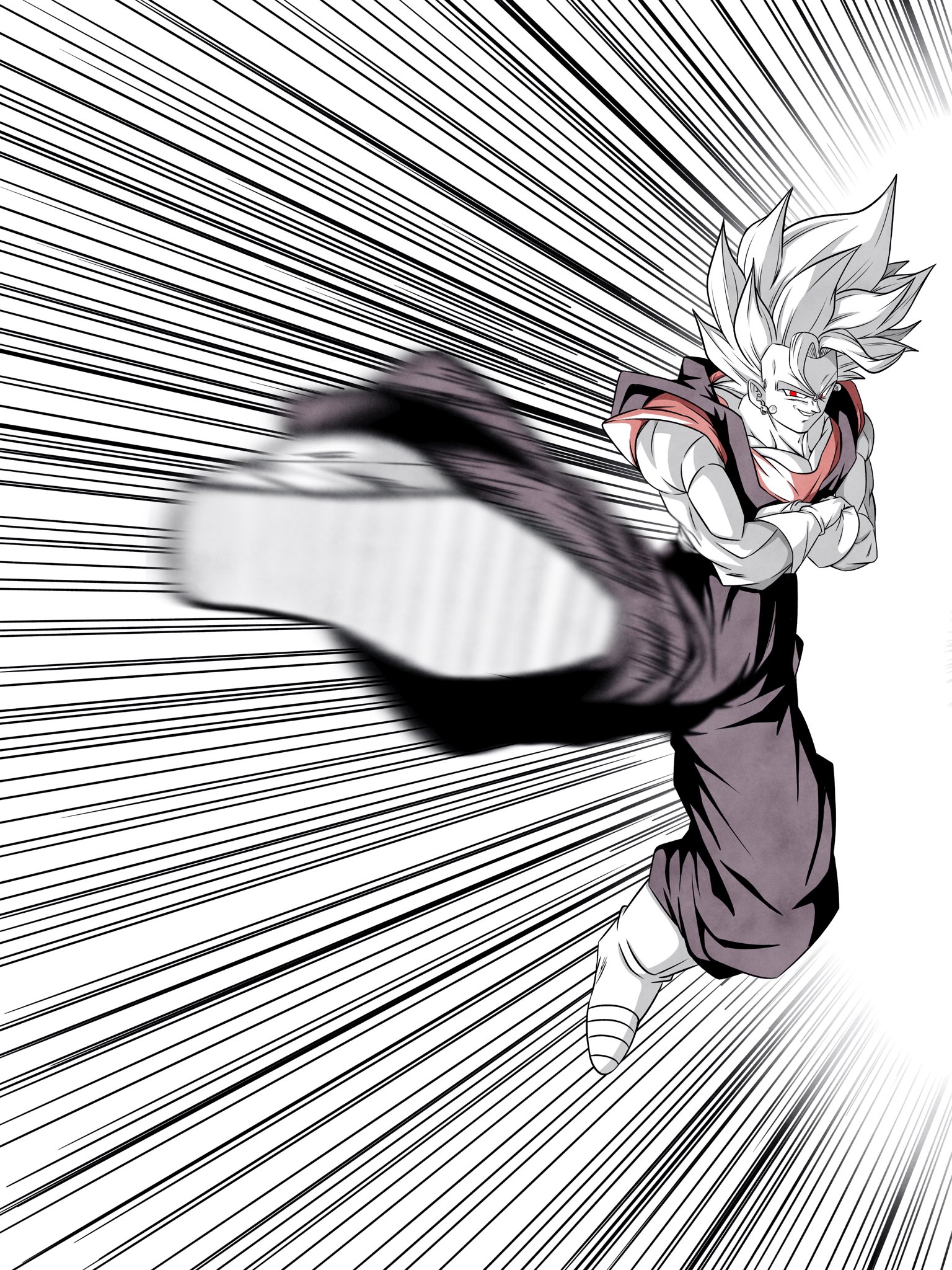 1boy boots commentary_request crossed_arms dougi dragon_ball dragonball_z feet flying_kick foot_focus full_body gloves grey_shirt highres kenran_dokkan kicking limited_palette male_focus motion_blur motion_lines muscular muscular_male orange_shirt red_eyes shirt solo speed_lines spiked_hair super_saiyan super_saiyan_1 vegetto