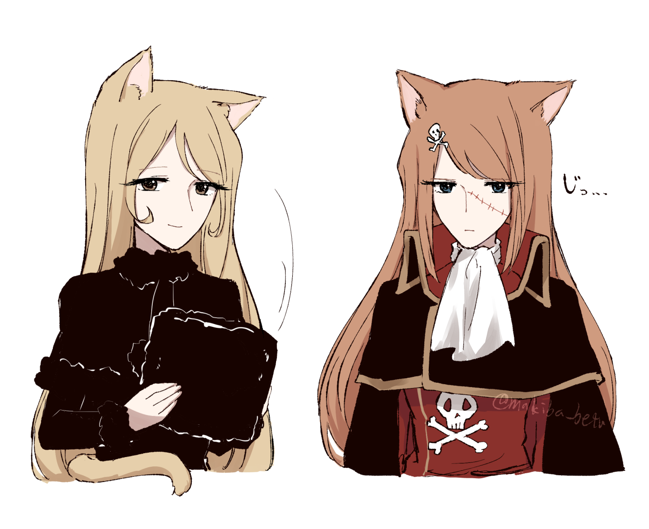 2girls animal_ear_fluff animal_ears artist_name ascot black_cape black_capelet black_dress blonde_hair blue_eyes brown_eyes cape capelet cat_ears cat_girl cat_tail colored_inner_animal_ears commentary_request dress emeraldas expressionless eyelashes funeral_dress fur-trimmed_headwear fur-trimmed_jacket fur_hat fur_trim furry ginga_tetsudou_999 hair_ornament harlock_saga hat jacket kemonomimi_mode koto_(shiberia39) light_smile long_hair looking_at_viewer maetel multiple_girls orange_hair queen_emeraldas red_cape scar scar_on_face signature simple_background skull skull_hair_ornament skull_print smile tail tail_raised twitter_username uchuu_kaizoku_captain_harlock unworn_hat unworn_headwear very_long_hair white_ascot white_background