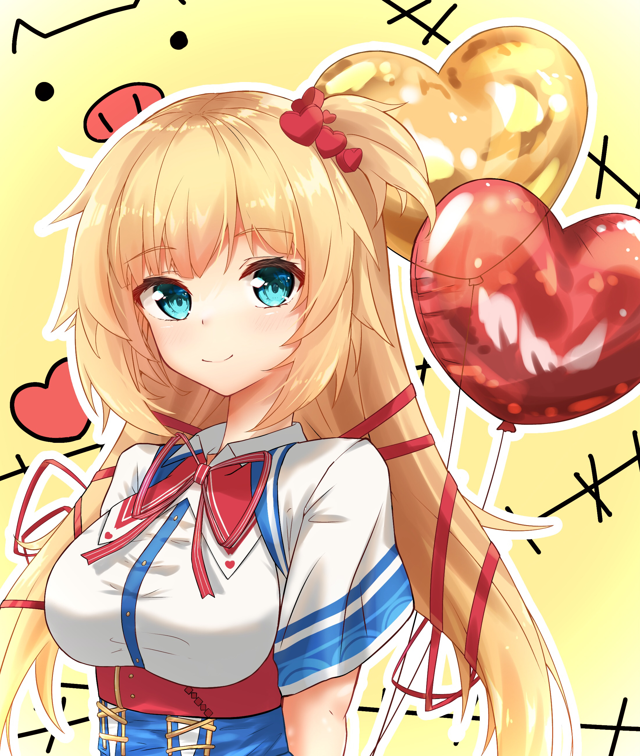 1girl absurdres akai_haato akai_haato_(1st_costume) balloon blue_eyes blue_skirt closed_mouth collared_shirt commentary_request haaton_(akai_haato) hair_ornament hair_ribbon heart heart_balloon heart_hair_ornament high-waist_skirt highres hololive long_hair one_side_up red_ribbon ribbon shirt skirt smile solo twintails u_da_desu very_long_hair virtual_youtuber white_shirt
