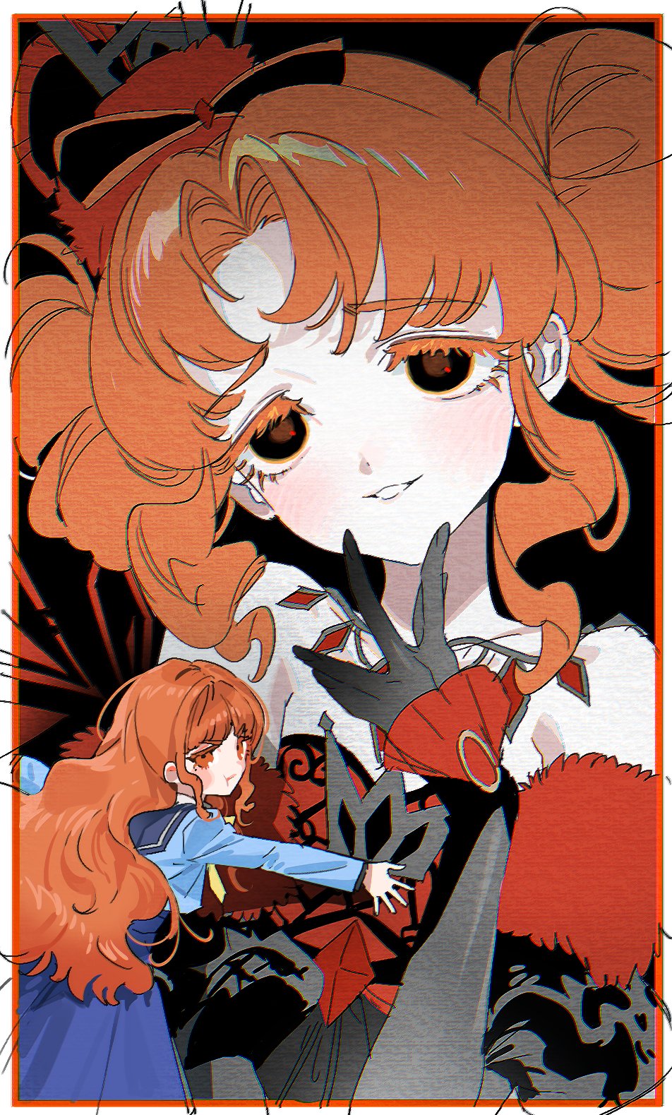 bare_shoulders black_background black_eyes black_gloves blue_jacket blue_sailor_collar blue_skirt border colored_eyelashes commentary_request double_bun dress dual_persona elbow_gloves furrowed_brow gloves gogumata hair_bun hand_on_own_chin hand_up hat highres himitsu_no_aipri idol idol_clothes jacket korean_commentary light_blush long_hair long_sleeves multiple_views off-shoulder_dress off_shoulder orange_border orange_eyes orange_hair paradise_private_academy_school_uniform parted_bangs parted_lips pout pretty_series red_dress red_hat sailor_collar school_uniform shinomiya_rinrin skirt standing teeth v-shaped_eyebrows wavy_hair wavy_sidelocks white_border