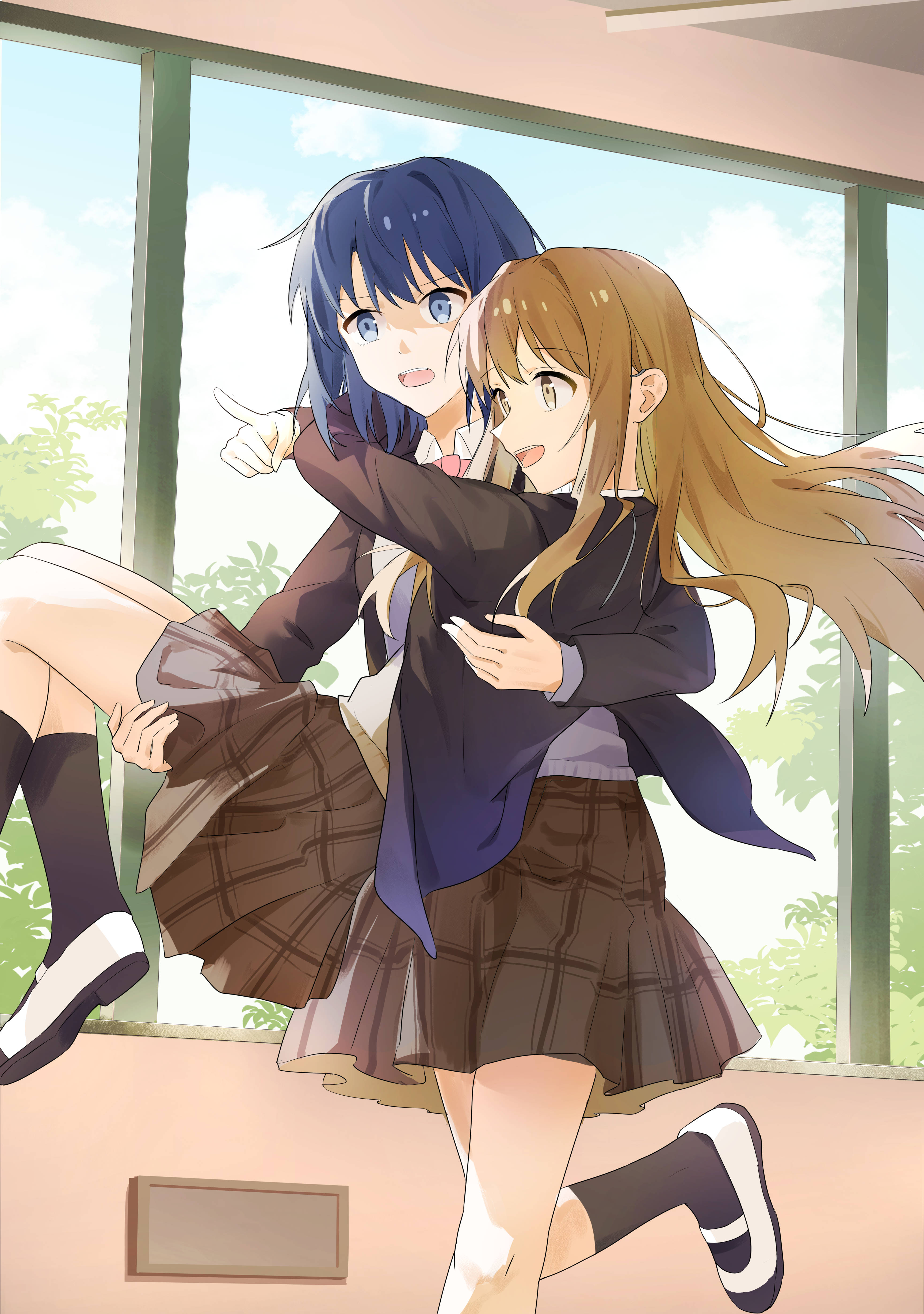 2girls absurdres adachi_sakura adachi_to_shimamura arms_around_neck black_jacket black_socks blazer blue_eyes blue_hair brown_eyes brown_hair brown_skirt carrying collared_shirt commentary_request grey_sweater hand_on_another's_thigh highres indoors jacket long_hair lrhwushang mary_janes medium_hair multiple_girls open_mouth plaid_clothes plaid_skirt pleated_skirt princess_carry school_uniform shimamura_hougetsu shirt shoes skirt socks sweater white_shirt white_shoes yuri