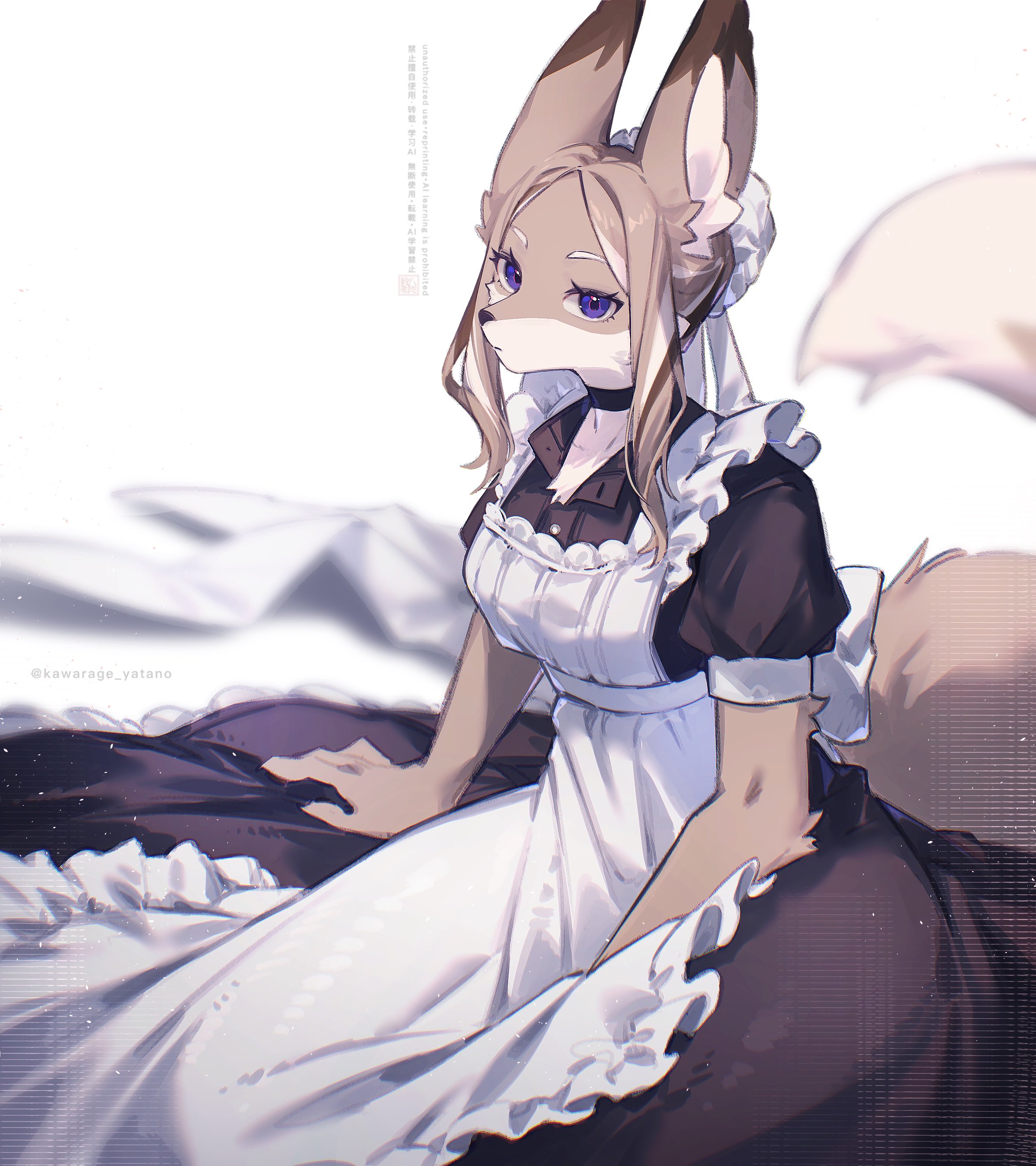 1girl absurdres animal_ear_fluff animal_ears animal_nose apron black_choker black_dress black_hair blue_eyes brown_fur brown_hair choker closed_mouth commentary_request dress fox_ears fox_girl fox_tail frilled_apron frills furry furry_female hand_between_thighs hat highres kawarage_yatano looking_at_viewer maid maid_apron mob_cap multicolored_hair open_collar original parted_bangs sitting snout tail twitter_username two-tone_fur white_background white_fur white_hair