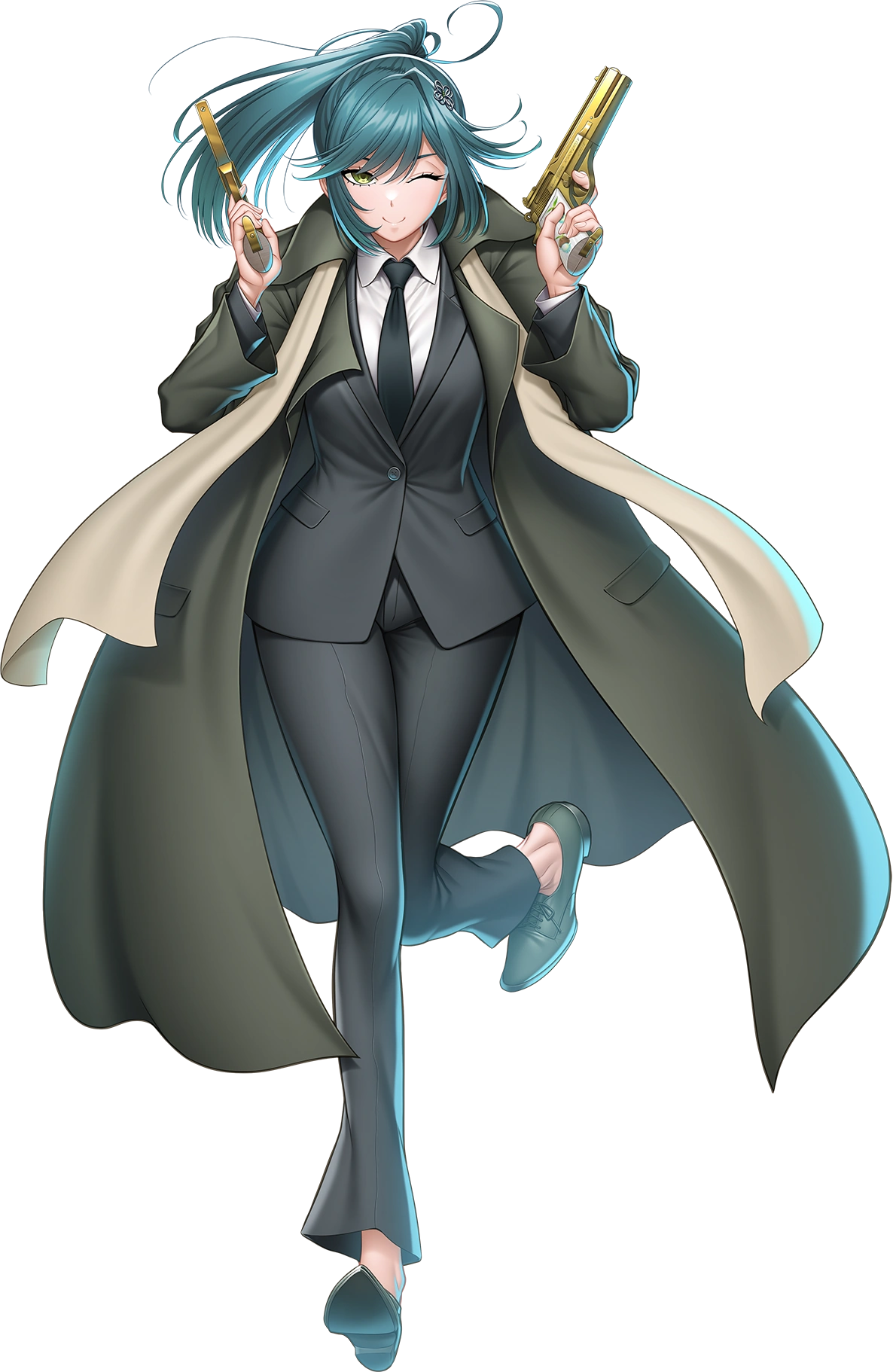 1girl :> alternate_costume black_lagoon breasts crossdressing crossdressing_(ftm) curvy formal_clothes green_eyes green_hair gun high_ponytail holding holding_gun holding_weapon izumo_kinu jumping large_breasts long_hair looking_at_viewer official_alternate_costume official_art one_eye_closed pants ponytail scarf shirt smile solo standing suit taimanin_(series) taimanin_rpgx transparent_background weapon white_shirt wide_hips wink zol