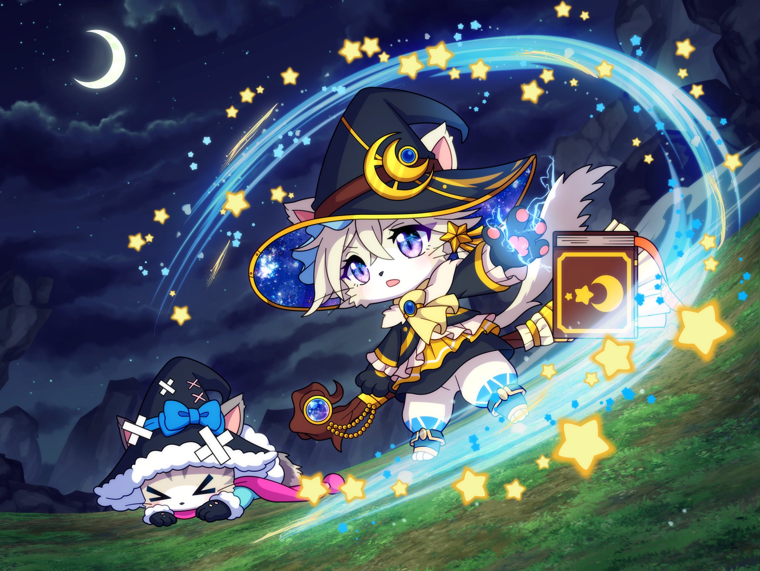 >_< 2girls animal_ears animal_feet animal_hands ascot barefoot black_gloves black_hat black_shirt blonde_hair blue_bow blue_coat book bow cat_busters cat_ears cat_girl cat_tail cloud coat commentary_request crescent_moon fur-trimmed_gloves fur-trimmed_headwear fur_trim furry furry_female gloves grass hat highres holding holding_staff luna_(cat_busters) mafumofu_(cat_busters) magic moon multiple_girls night oceannuts open_mouth outdoors outstretched_hand pants pawpads pink_scarf purple_eyes scarf shirt short_hair staff star_(symbol) tail white_pants witch_hat wizard yellow_ascot