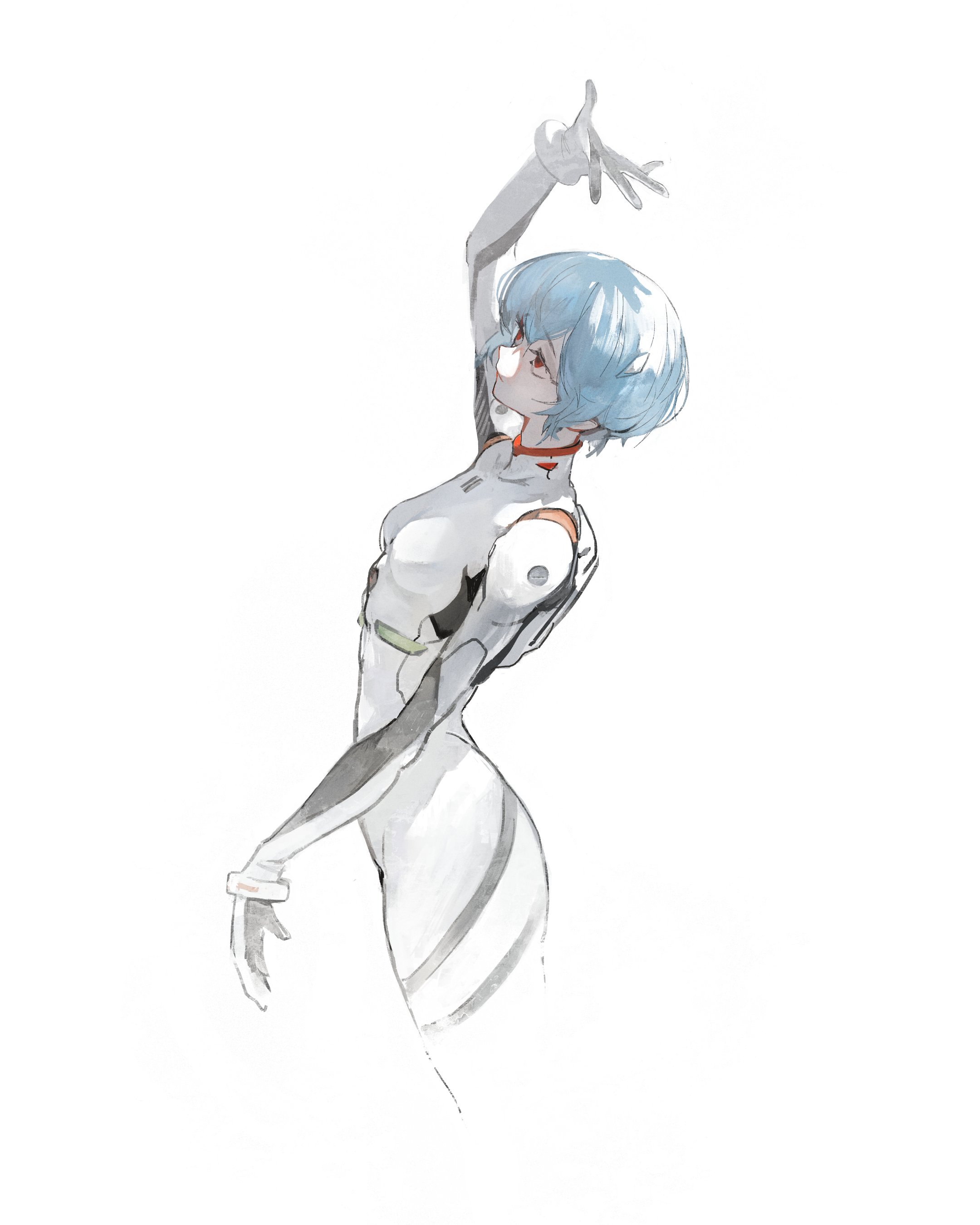 1girl absurdres ayanami_rei blue_hair bodysuit breasts fading hair_between_eyes hair_ornament hand_up headgear highres interface_headset_(evangelion) kanji_(nievart) looking_up mecha_pilot_suit neon_genesis_evangelion plugsuit_(evangelion) red_eyes science_fiction short_hair small_breasts solo white_background white_bodysuit