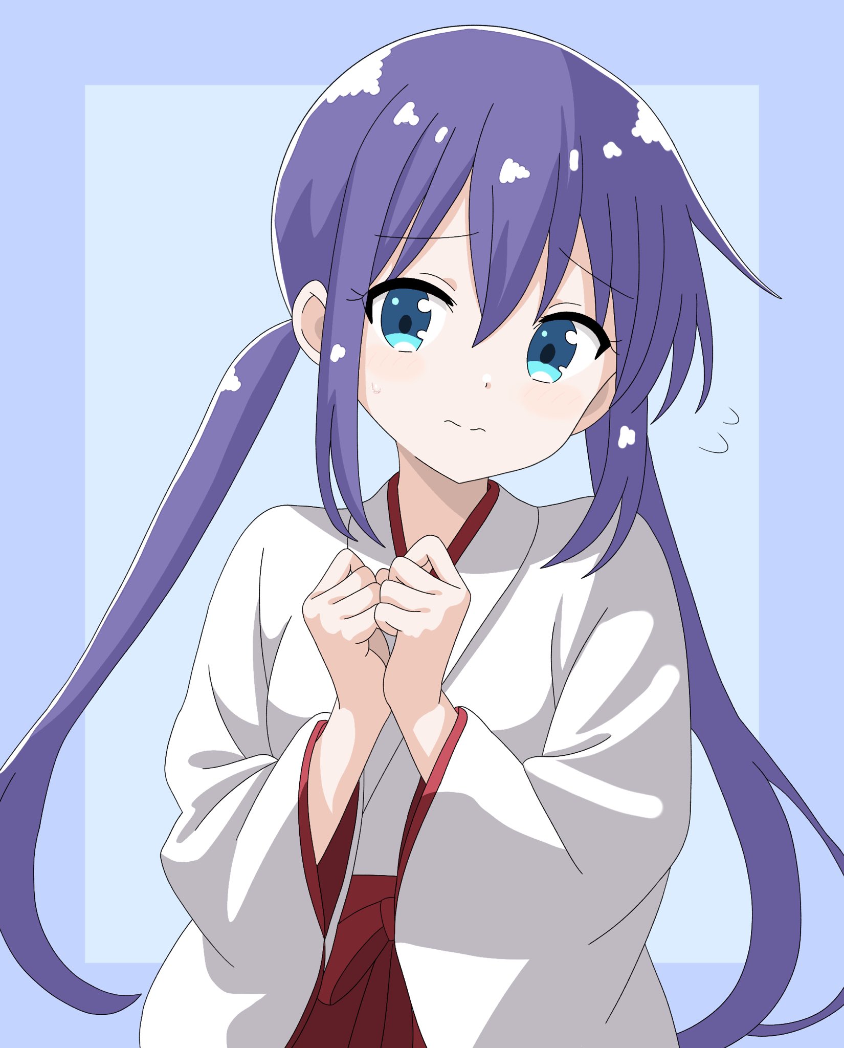 1girl alternate_costume blue_background blue_eyes blue_hair blush closed_mouth dot_nose feet_out_of_frame female_focus hair_between_eyes japanese_clothes jin_1116 koisuru_asteroid long_hair long_sleeves looking_at_viewer manaka_ao miko simple_background solo standing sweatdrop twintails