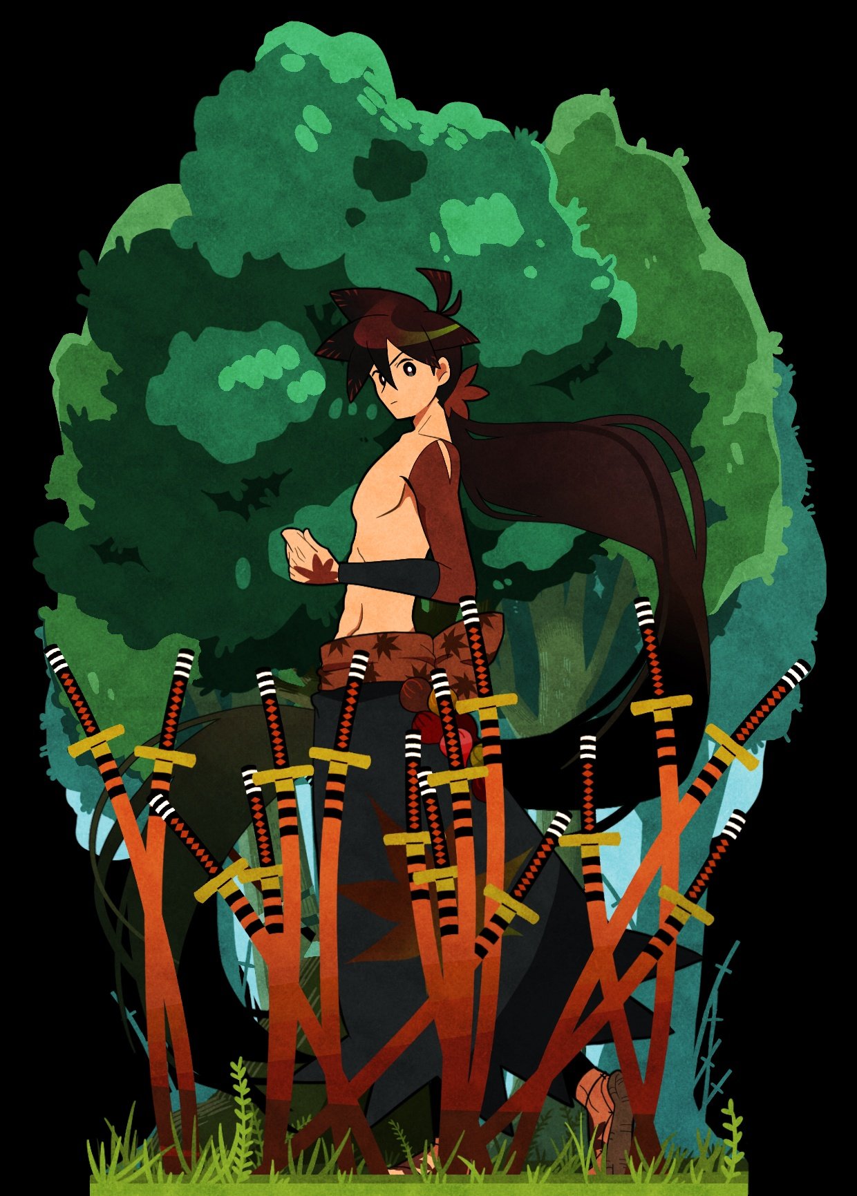 1boy black_eyes black_hair black_hakama commentary_request detached_sleeves faux_figurine field_of_blades from_side full_body grass hair_between_eyes hakama hakama_skirt hakka_oishie highres japanese_clothes katana katanagatari leaf_print long_hair looking_at_viewer looking_to_the_side low_ponytail male_focus maple_leaf_hair_ornament maple_leaf_print planted planted_sword planted_weapon ponytail print_hakama red_sleeves sandals sheath sheathed skirt solo standing sword tree very_long_hair weapon yasuri_shichika