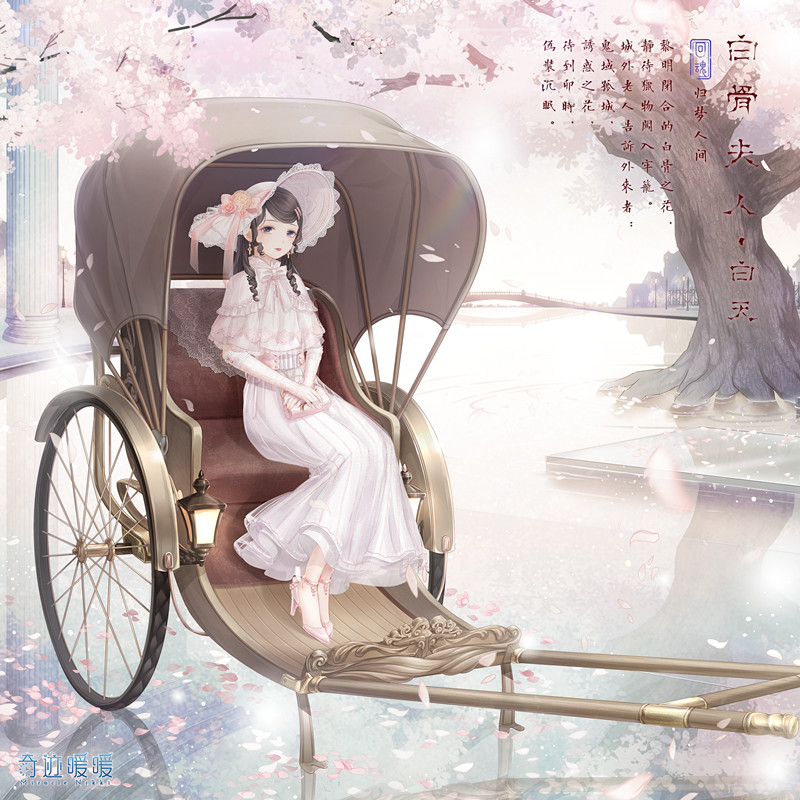 1girl artist_request bag blue_eyes bow bowtie bridge brown_hair capelet carriage character_name cherry_blossoms chinese_text closed_mouth collared_capelet copyright_logo day dot_nose dress expressionless eyelashes falling_petals flower frilled_capelet frills full_body gate hair_ornament hairclip handbag hands_on_lap hat hat_bow hat_flower high_collar high_heels holding holding_bag lace-trimmed_headwear lace_trim light_blush light_particles lipstick logo long_dress long_hair long_sleeves looking_at_viewer makeup mascara miracle_nikki miss_bone_(miracle_nikki) nikki_(series) no_socks official_art outdoors own_hands_together parallel_hairclips petals pillar pink_bag pink_bow pink_flower pink_rose pink_shoes pleated_dress puddle red_lips reflective_floor ringlets road rose shoes sidelocks sitting sky solo spring_(season) stiletto_heels street striped_bow striped_bowtie striped_clothes striped_dress sun_hat swept_bangs third-party_source three-quarter_sleeves translation_request tree vertical-striped_clothes vertical-striped_dress white_bow white_bowtie white_capelet white_dress white_hat white_sky
