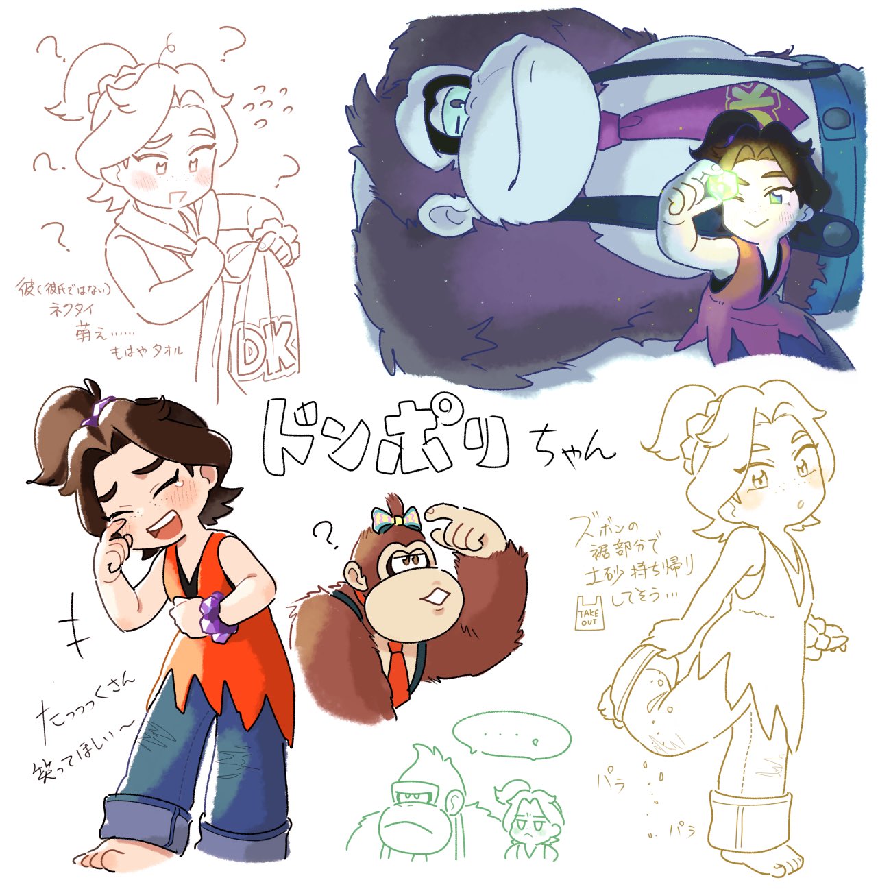 ... 1boy 1girl ? barefoot bow commentary_request donkey_kong donkey_kong_(series) donkey_kong_bananza freckles furry furry_male glowing hair_bow highres holding holding_rock laughing multiple_views necktie nintendo o_k_ra_ra one_eye_closed open_mouth pauline_(mario) pauline_(young)_(mario) red_necktie rock suspenders translation_request