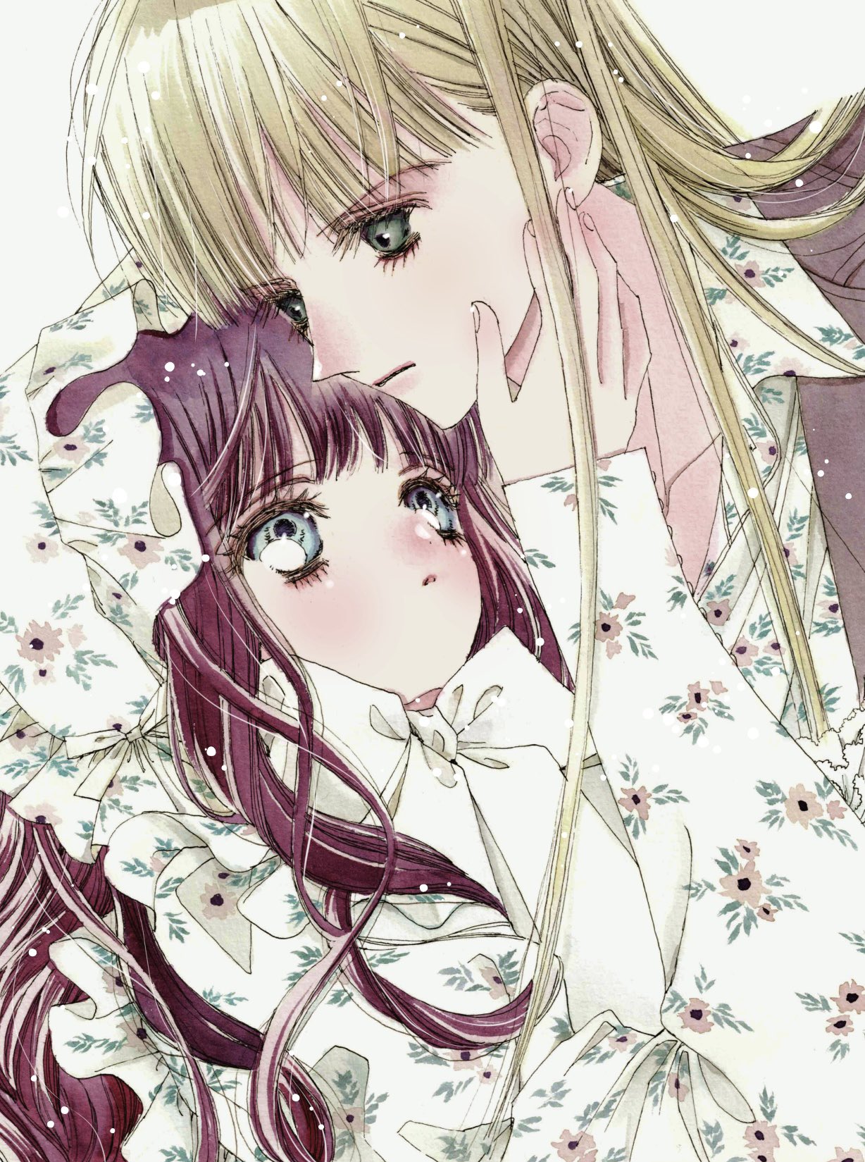 2girls blonde_hair blush hand_on_another's_cheek hand_on_another's_face headdress highres long_hair looking_at_another multiple_girls nui_nakato original red_hair wavy_hair