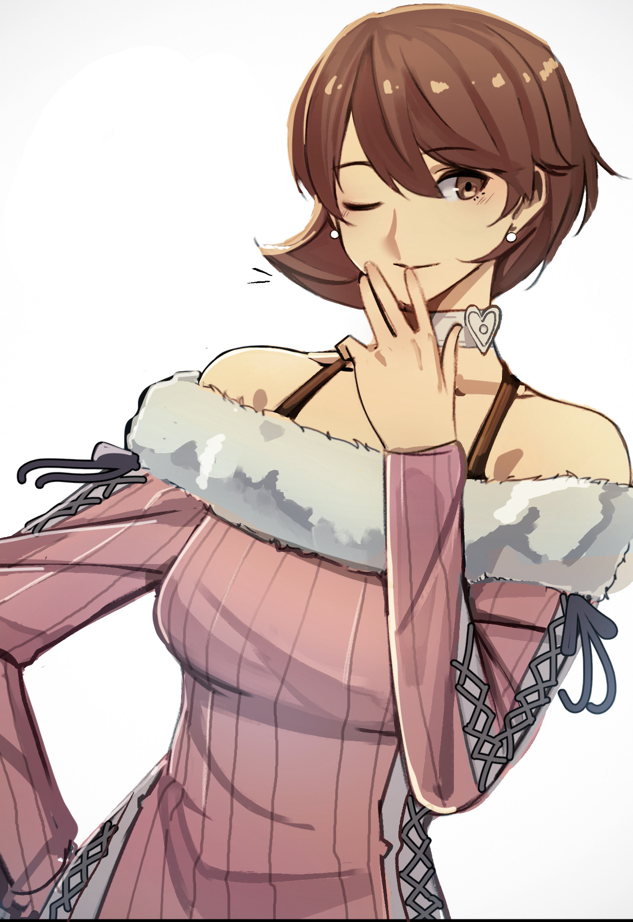 0cdnt 1girl bare_shoulders breasts brown_eyes brown_hair earrings heart jewelry large_breasts long_sleeves looking_to_the_side one_eye_closed persona persona_3 short_hair sweater takeba_yukari white_background