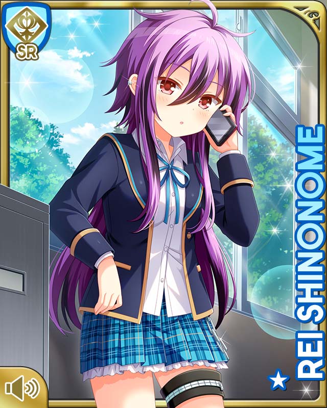 1girl :o armband blazer blue_jacket blue_neckwear blue_skirt card_(medium) chain character_name classroom day girlfriend_(kari) indoors jacket long_hair official_art open_mouth plaid_clothes plaid_skirt purple_hair qp:flapper red_eyes school school_uniform shinonome_rei shirt skirt solo tagme wallet_chain white_shirt