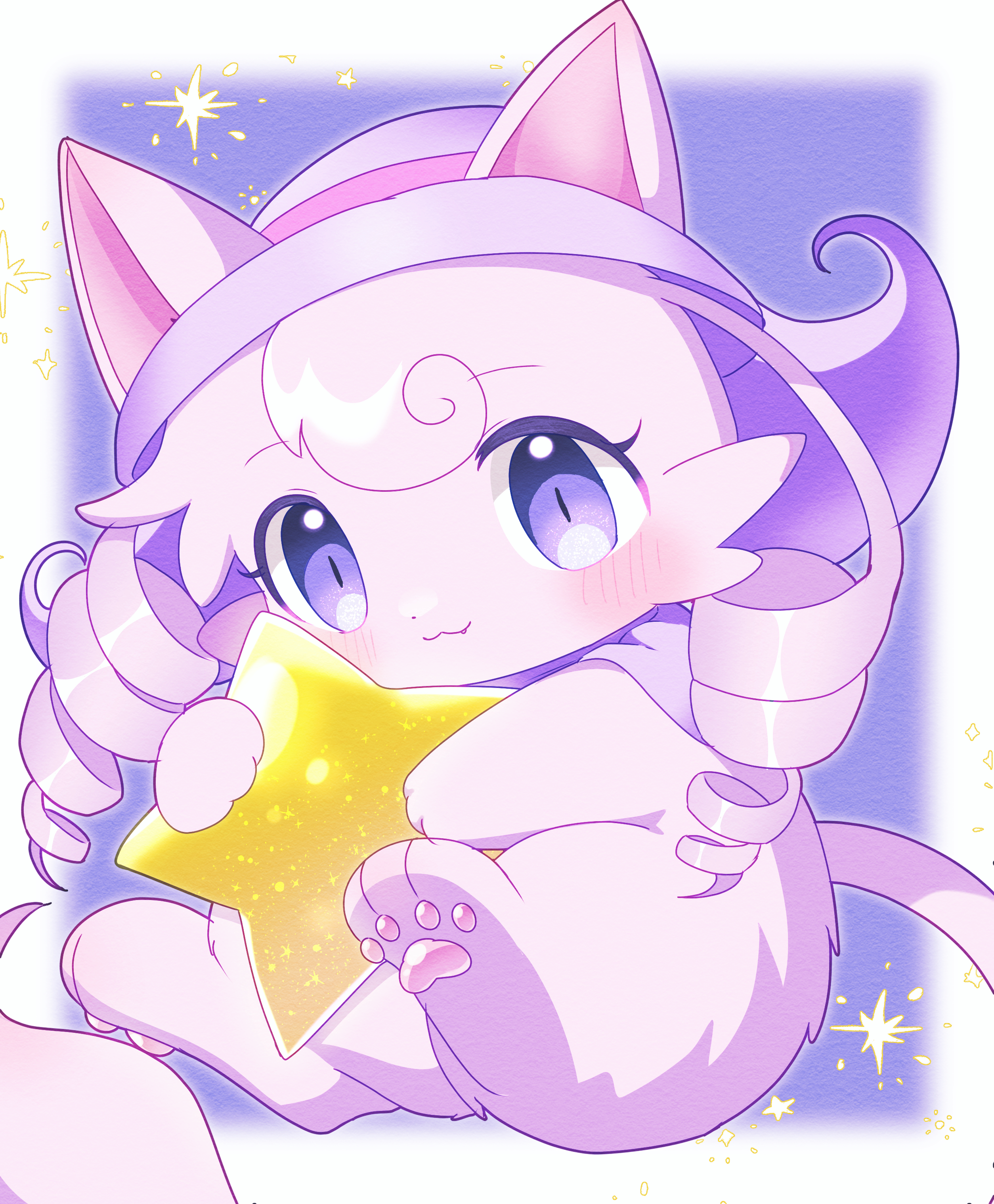 1girl :3 absurdres animal_ears animal_feet animal_hands blush border cape cat_ears cat_girl cat_tail chibi chibi_only chibikemo commentary_request devilconnection digitigrade furry furry_female hat highres looking_at_viewer makemon! meteor_(makemon!) mirun_migyu pawpads pink_fur pink_hair purple_background purple_cape purple_eyes purple_hat purple_theme ringlets solo star_(symbol) tail white_border yume_kawaii
