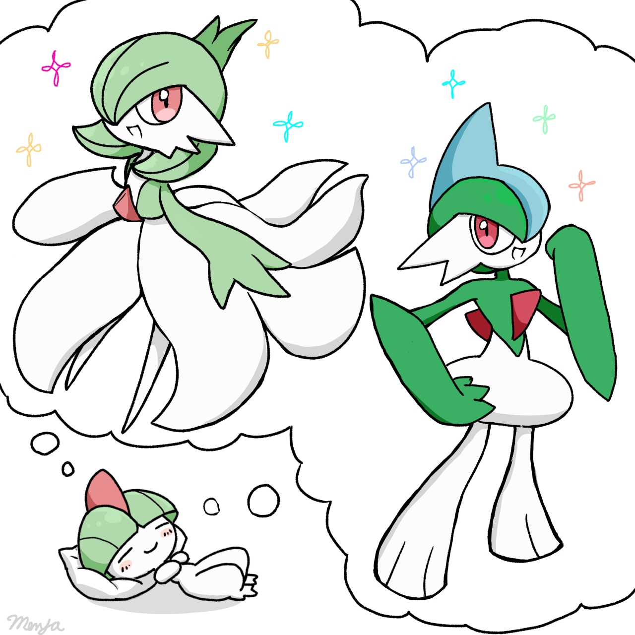 1boy 1girl 1other =_= arms_up artist_name blue_hair blunt_bangs blush blush_stickers bob_cut bowl_cut clenched_hand closed_eyes closed_mouth colored_skin dreaming flat_chest full_body gallade gardevoir gen_3_pokemon gen_4_pokemon green_hair green_skin hair_over_one_eye hand_on_own_hip hand_up happy lying mohawk monya multicolored_hair multicolored_skin nintendo no_feet on_back one_eye_covered open_mouth outstretched_arms pillow pokemon pokemon_(creature) ralts short_hair signature simple_background smile sparkle speech_bubble standing thought_bubble two-tone_hair two-tone_skin white_background white_skin
