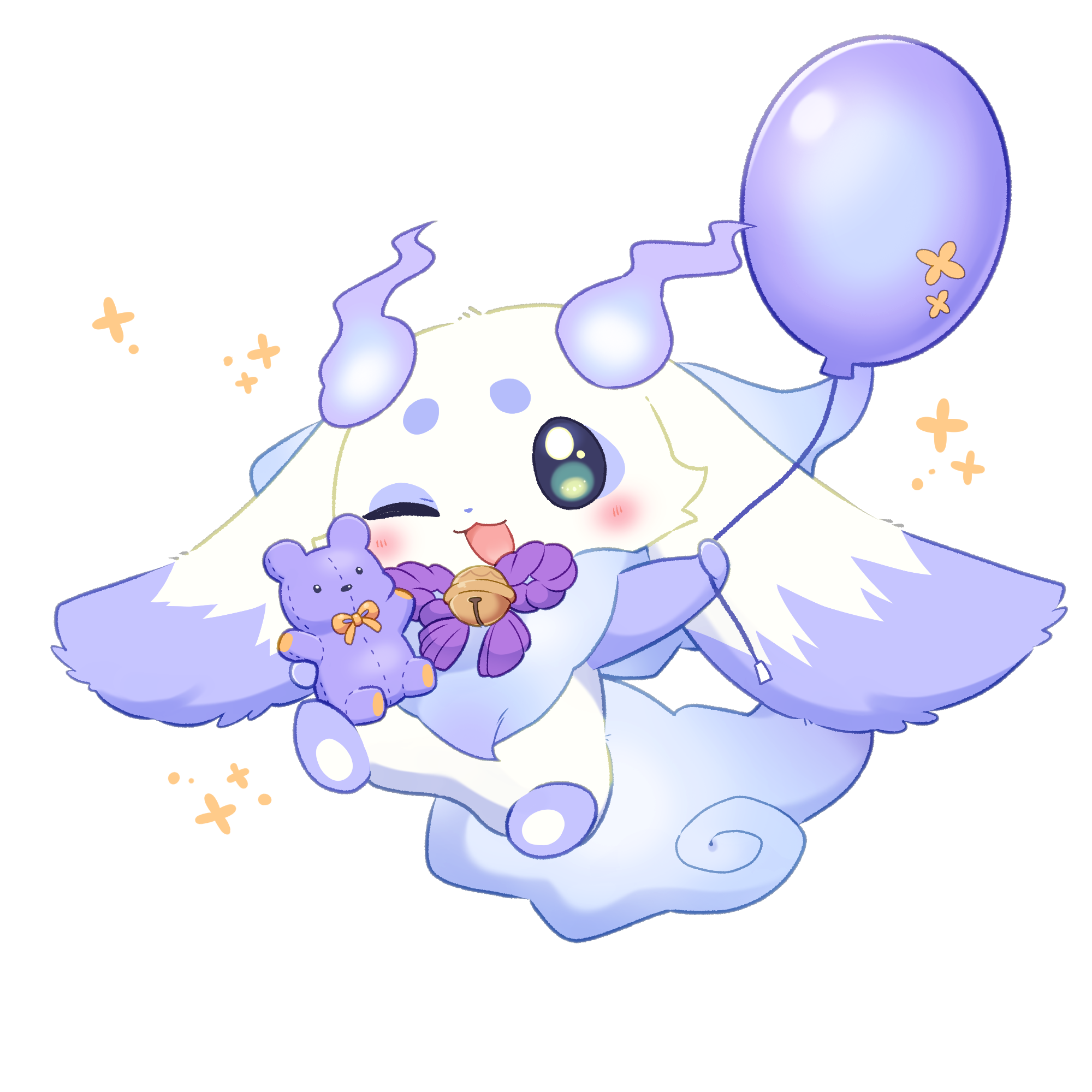 1other :3 ;d animal_ears aqua_eyes balloon bell blush chibi chibi_only chibikemo commentary_request creature creature_focus eyeshadow fire full_body furry highres holding holding_balloon holding_stuffed_toy jingle_bell lunlun_(nijisanji) makeup nana_(harebiyorinana) nijisanji one_eye_closed open_mouth other_focus purple_eyeshadow purple_fire purple_fur smile solo sparkle stuffed_animal stuffed_toy tachi-e tail teddy_bear variant_set virtual_youtuber white_background white_fur