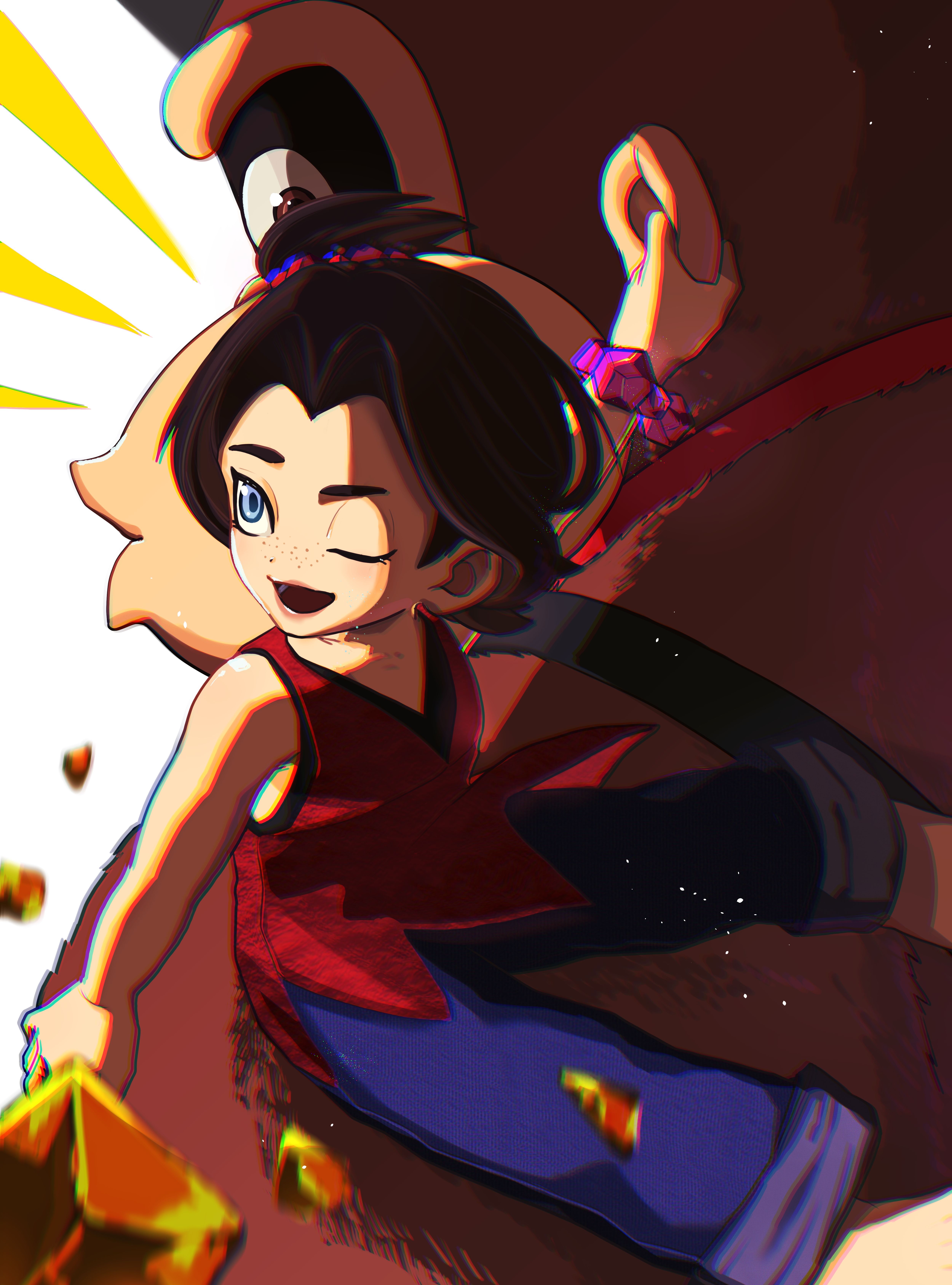 1boy 1girl absurdres blue_eyes brown_hair commentary_request donkey_kong donkey_kong_(series) donkey_kong_bananza freckles furry furry_male gorilla hand_on_another's_ear highres kuchiwasa nintendo one_eye_closed pauline_(mario) pauline_(young)_(mario) sitting_on_shoulder