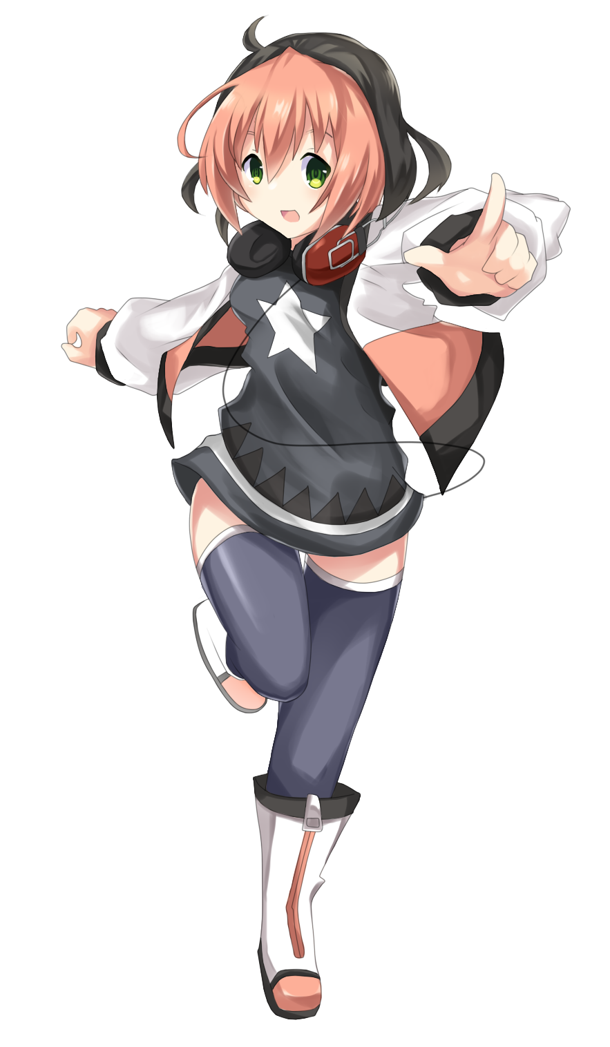 1girl black_hair black_shirt black_thighhighs boots breasts colored_bangs commentary cowlick english_commentary full_body green_eyes hair_between_eyes headphones headphones_around_neck highres jacket kunknee looking_at_viewer multicolored_hair open_clothes open_jacket open_mouth osu! pink_hair pippi_(osu!) pointing pointing_at_viewer shirt short_hair small_breasts solo tachi-e thighhighs transparent_background two-tone_hair variant_set white_boots white_jacket