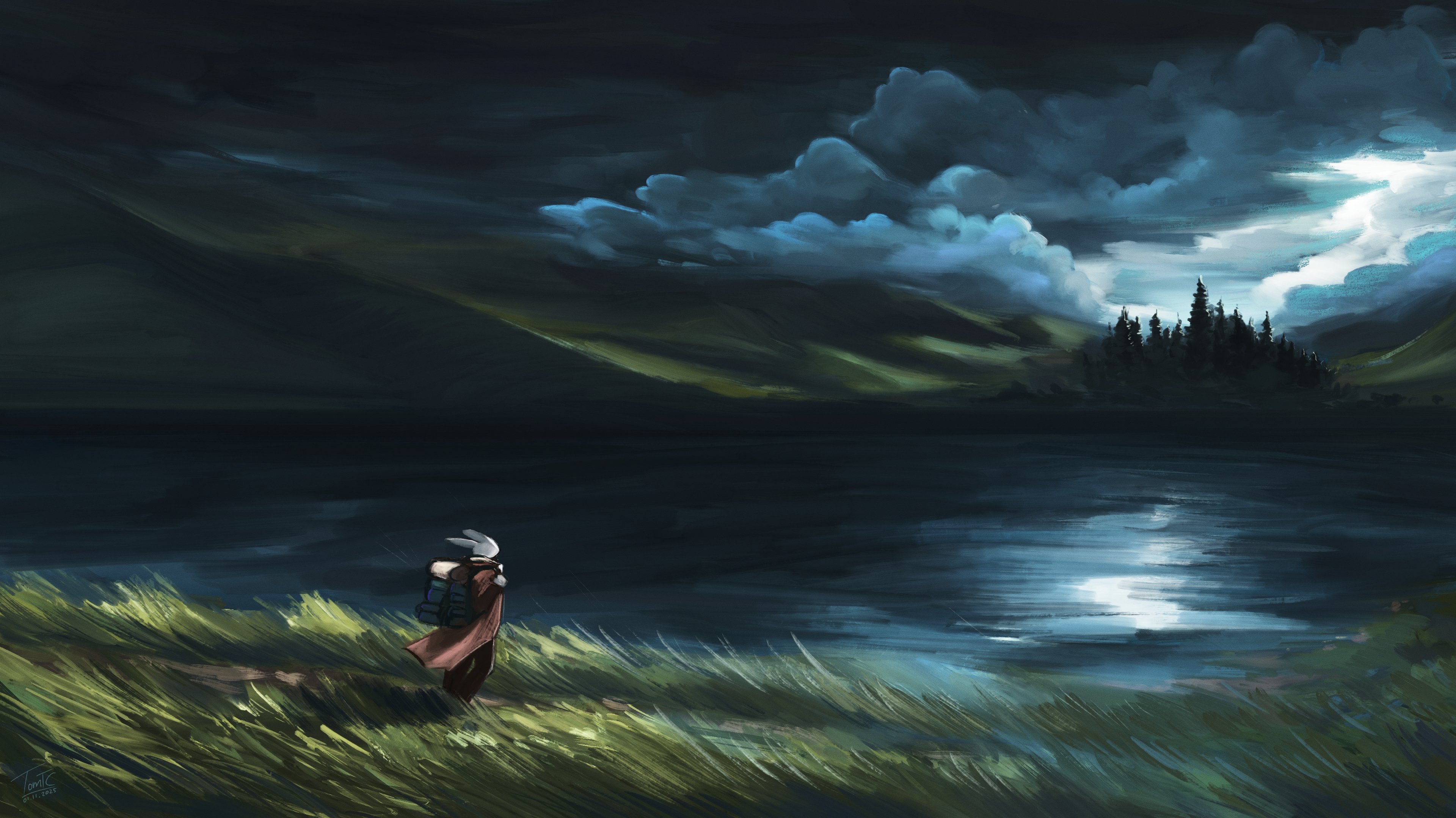 1boy backpack bag black_pants body_fur brown_cloak cloak cloud day facing_away forest from_behind full_body furry furry_male grass grey_sky hand_up lake long_sleeves nature original outdoors pants path rabbit_boy rabbit_ears road scenery sky solo standing tomtc white_fur wide_shot
