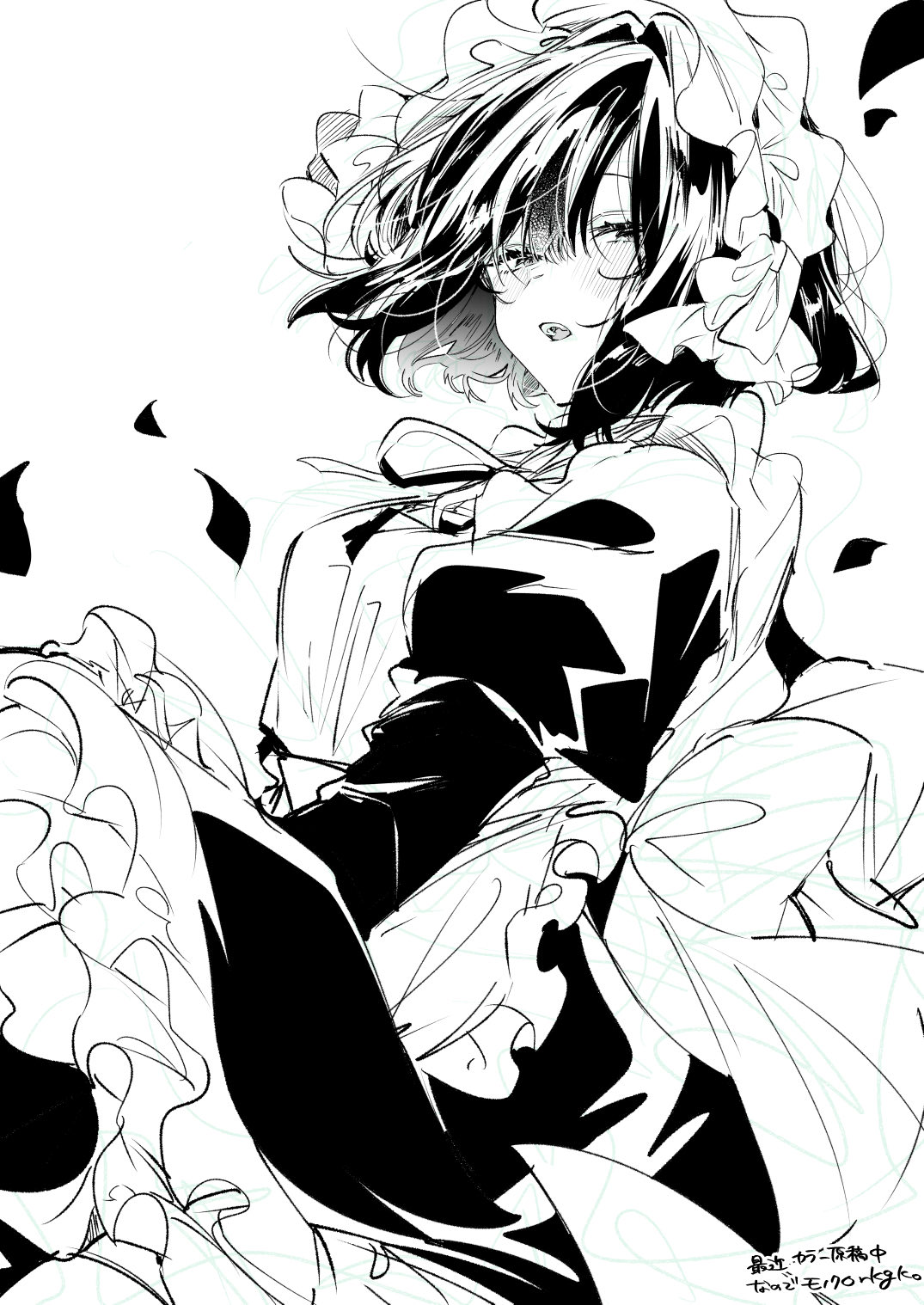 1girl apron commentary greyscale highres juliet_sleeves long_sleeves maid maid_headdress monochrome neck_ribbon open_mouth original puffy_sleeves ribbon short_hair sketch solo symbol-only_commentary takeshima_eku unfinished