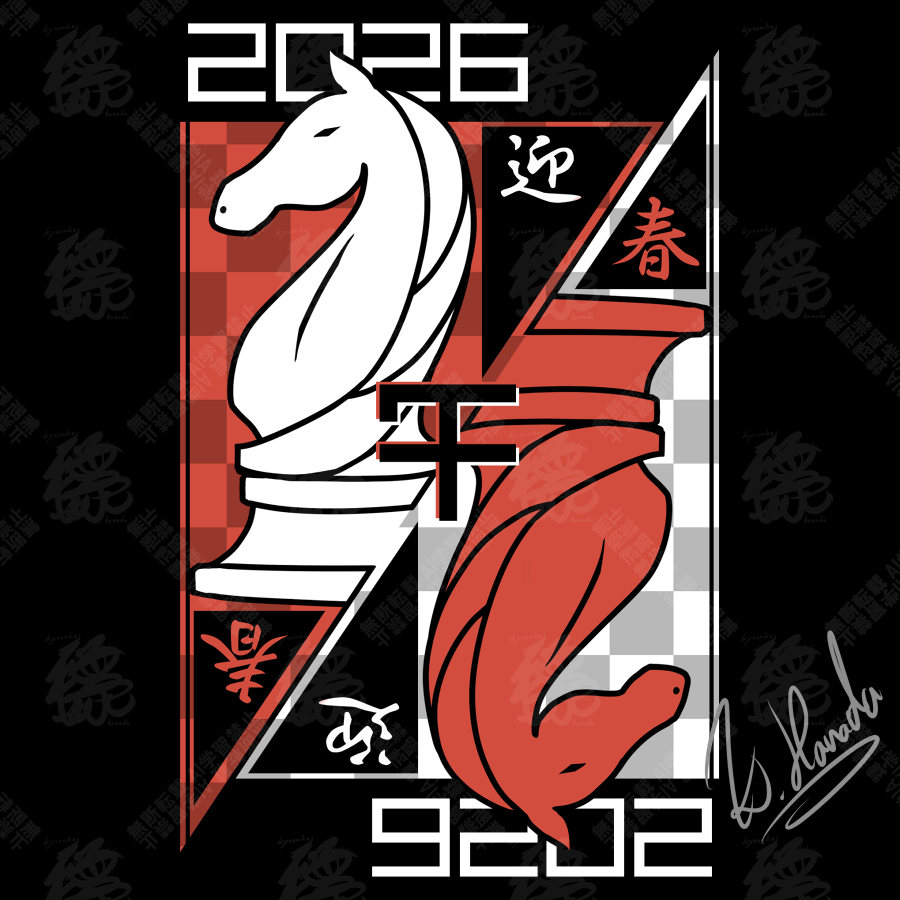2026 alu.m_(alpcmas) black_background chess_piece chinese_zodiac commentary_request knight_(chess) no_humans original signature translation_request watermark watermark_grid year_of_the_horse