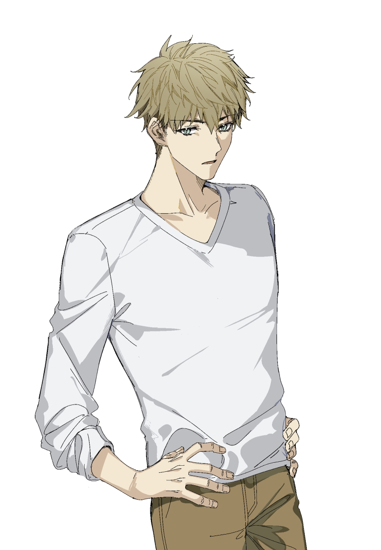 1boy arlizi blonde_hair blue_eyes brown_pants collarbone commentary_request cowboy_shot hair_between_eyes hands_on_own_hips long_sleeves male_focus pants parted_lips shirt short_hair simple_background solo spy_x_family t-shirt twilight_(spy_x_family) very_short_hair white_background white_shirt