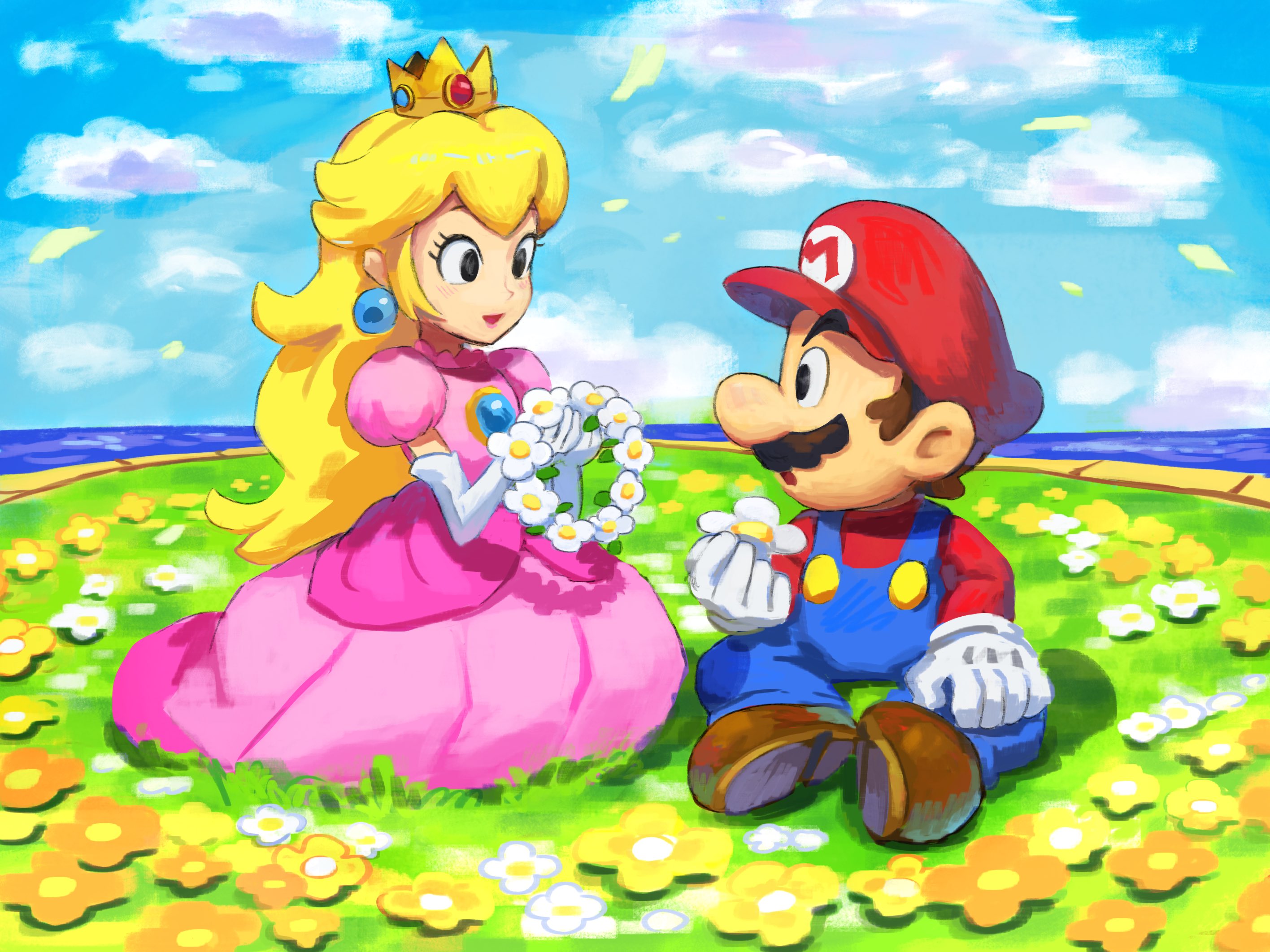 1boy 1girl blonde_hair blue_overalls blush brown_hair commentary crown dress earrings elbow_gloves facial_hair field flower flower_field gloves hat highres holding jewelry long_hair mario mario_&_luigi_rpg mario_(series) mustache nintendo open_mouth outdoors overalls pink_dress princess_peach red_hat red_shirt shirt short_hair sitting smile sphere_earrings symbol-only_commentary white_gloves yamari_(ya_mari_6363)
