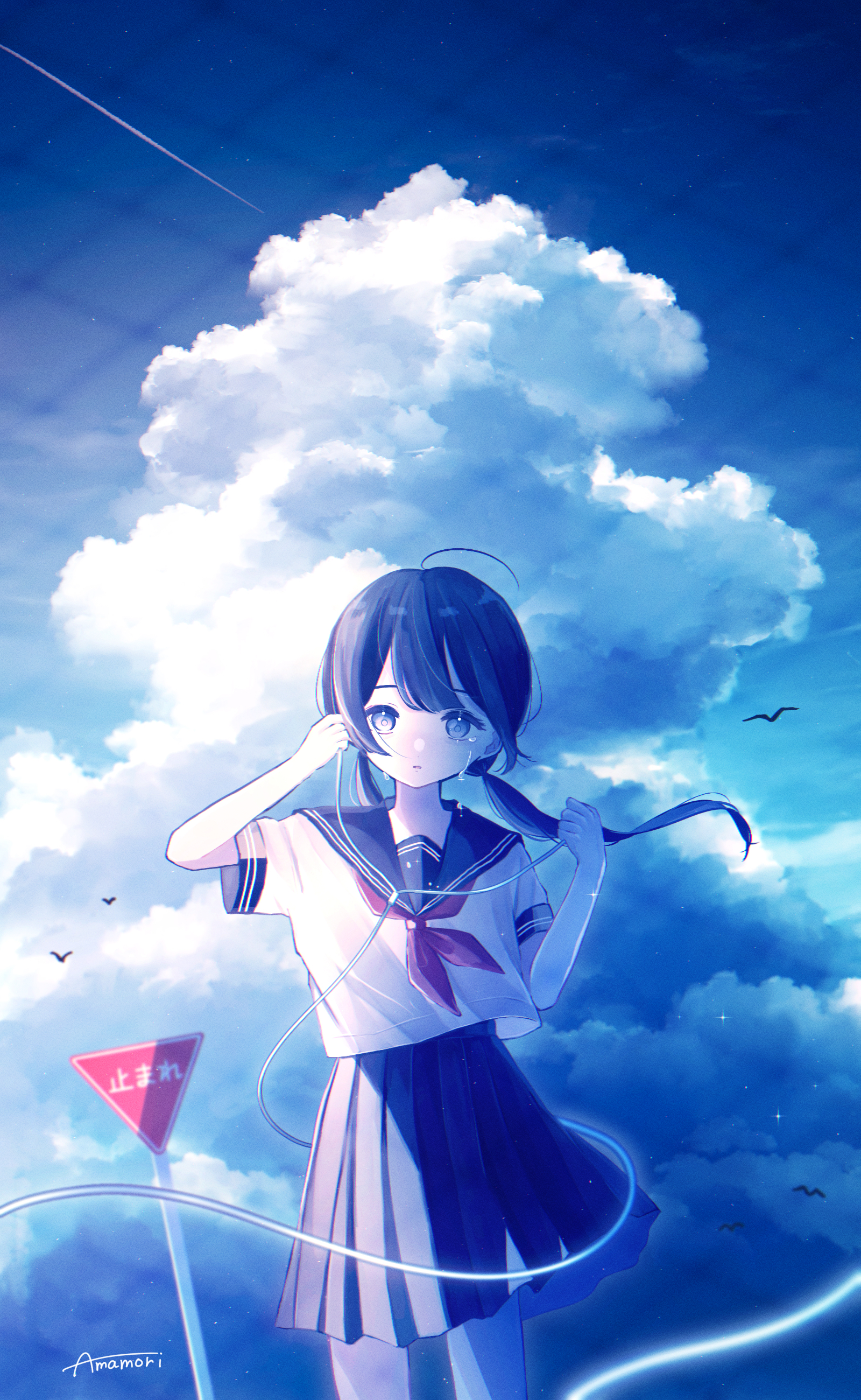 1girl absurdres amenomori_howa bird cloud cloudy_sky commentary_request crying crying_with_eyes_open earbuds earphones highres holding long_hair looking_at_viewer low_twintails neckerchief original outdoors pleated_skirt red_neckerchief sailor_collar school_uniform serafuku shirt short_sleeves sign skirt sky solo tears twintails white_shirt