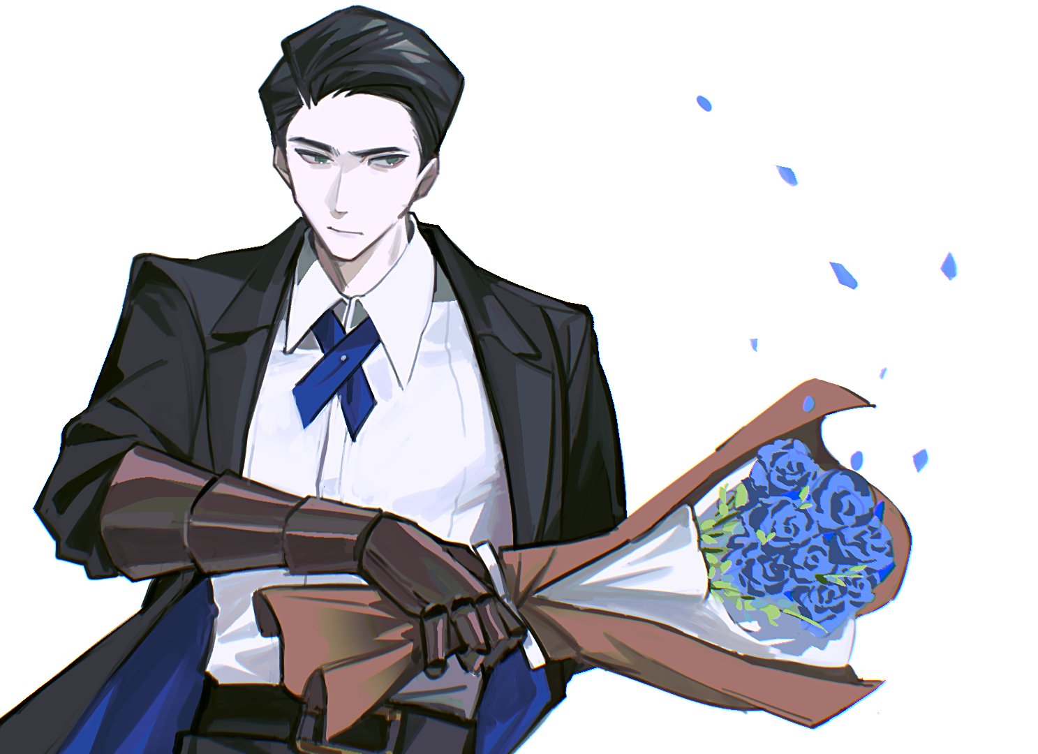 1boy black_eyes black_hair black_pants blue_flower blue_ribbon bouquet closed_mouth collarbone commentary_request cowboy_shot falling_petals flower gauntlets limbus_company male_focus meursault_(project_moon) neck_ribbon official_alternate_costume pants petals project_moon ribbon shirt short_hair simple_background solo white_background white_shirt yasuihiruya