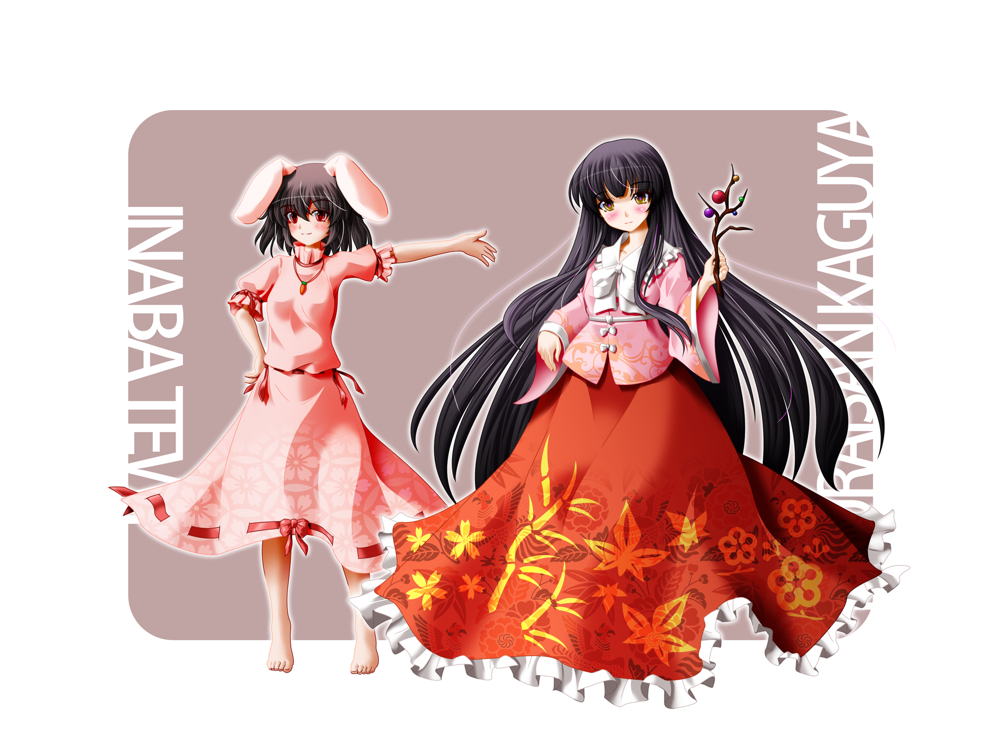 2girls animal_ears arm_up barefoot black_hair blush bow bow_button branch brown_eyes carrot_necklace character_name closed_mouth commentary_request dress feet floral_print floral_print_dress floral_print_skirt frilled_shirt_collar frilled_skirt frills full_body hand_on_own_chest hand_up highres holding holding_branch houraisan_kaguya inaba_tewi jeweled_branch_of_hourai jewelry kii_(mahoraba) long_hair long_skirt long_sleeves looking_at_viewer multiple_girls necklace outline outstretched_arm pink_dress pink_pupils pink_shirt print_dress print_skirt rabbit_ears red_eyes red_ribbon red_skirt ribbon ribbon-trimmed_sleeves ribbon_trim shirt short_hair short_sleeves skirt sleeve_ribbon smile standing touhou very_long_hair white_background white_bow white_outline wide_sleeves