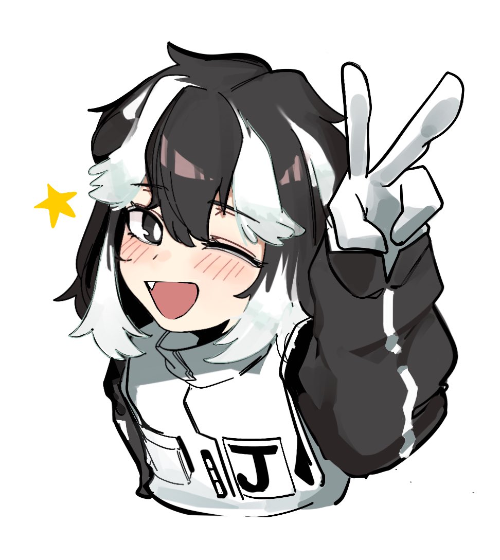 1boy black_eyes black_hair blush fang gloves jang_schna limbus_company looking_at_viewer multicolored_hair one_eye_closed open_mouth project_moon short_hair simple_background solo star_(symbol) upper_body v white_background white_gloves white_hair wldrnbag19