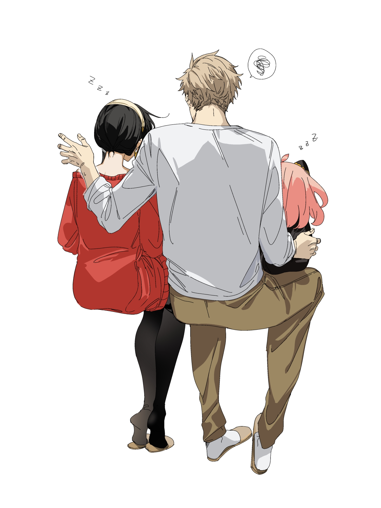 1boy 2girls adoptive_parent_and_adoptive_child ahoge anya_(spy_x_family) arlizi black_hair black_pantyhose blonde_hair brown_pants brown_slippers child commentary_request dress earrings family father_and_daughter from_behind full_body gold_earrings hairband hand_on_another's_back highres husband_and_wife invisible_chair jewelry long_sleeves medium_hair mother_and_daughter multiple_girls off-shoulder_sweater off_shoulder pants pantyhose pink_hair plantar_flexion red_sweater shirt short_hair simple_background sitting sitting_on_lap sitting_on_person sleeping slippers socks spoken_squiggle spy_x_family squiggle sweater sweater_dress t-shirt twilight_(spy_x_family) very_short_hair white_background white_hairband white_shirt white_socks yor_briar zzz