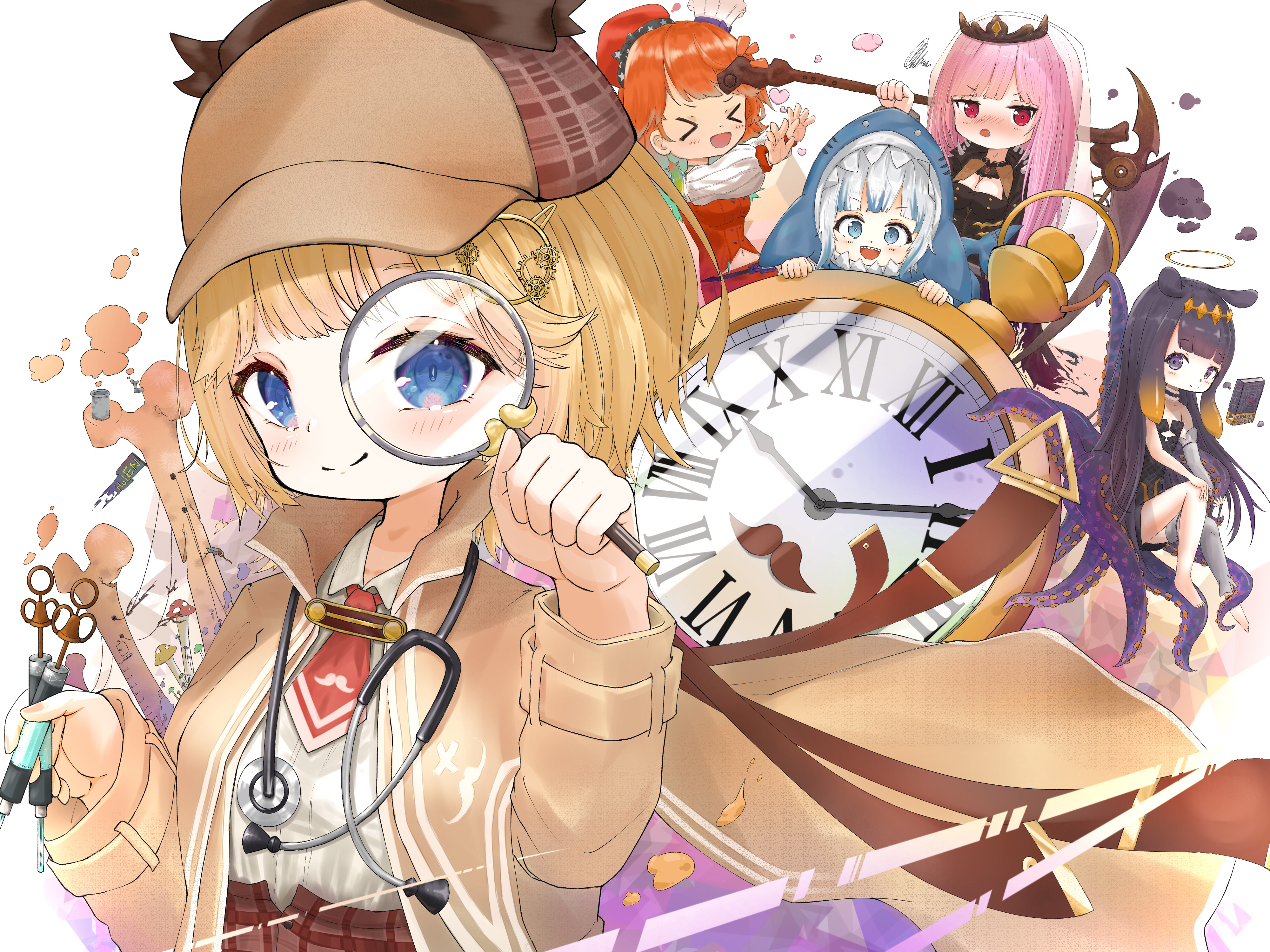 >_< 5girls absurdres animal_hood ao-chan_(ninomae_ina'nis) black_dress blonde_hair blue_eyes blue_hoodie blue_streaks brown_hat brown_jacket chibi closed_mouth collared_shirt commentary_request dress fins fish_tail gawr_gura gawr_gura_(1st_costume) grey_hair hat highres holding holding_magnifying_glass holding_scythe hololive hololive_english holomyth hood hoodie jacket long_hair looking_at_viewer magnifying_glass medium_hair mori_calliope mori_calliope_(1st_costume) multiple_girls necktie orange_hair pink_hair purple_eyes purple_hair red_eyes red_necktie scythe shark_girl shark_hood shark_tail shirt single_bare_foot smile tail takanashi_kiara takanashi_kiara_(1st_costume) takodachi_(ninomae_ina'nis) tentacle_hair tentacles u_da_desu very_long_hair virtual_youtuber watson_amelia watson_amelia_(1st_costume) white_shirt
