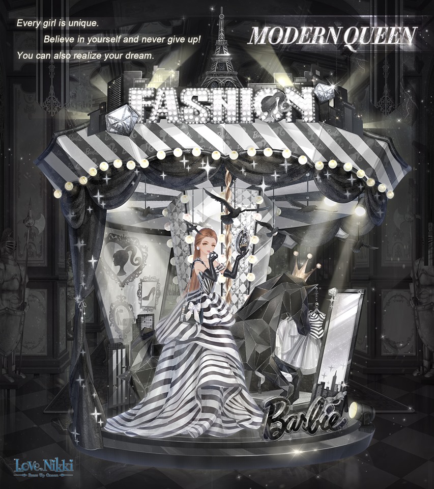 1girl applying_lipstick applying_makeup applying_own_makeup artist_request barbie_(franchise) bare_shoulders bird black_background black_dress black_gloves bow brown_eyes brown_hair building character_name checkered_floor copyright_logo copyright_name cosmetics crow dark-skinned_female dark_skin dress dress_bow earrings eiffel_tower elbow_gloves english_text expressionless forehead frilled_dress frills full-length_mirror full_body gloves gown holding holding_lipstick_tube holding_mirror indoors jewelry light_particles lipstick lipstick_tube logo long_dress long_hair looking_at_viewer makeup miracle_nikki mirror modern_queen_(miracle_nikki) nikki_(series) official_art painting_(object) parted_lips pleated_dress red_lips skyscraper sleeveless sleeveless_dress solo sparkle sphere_earrings spotlight stage statue straight_hair strap_slip striped_clothes striped_dress third-party_source two-tone_dress unworn_dress very_long_hair white_bow white_dress